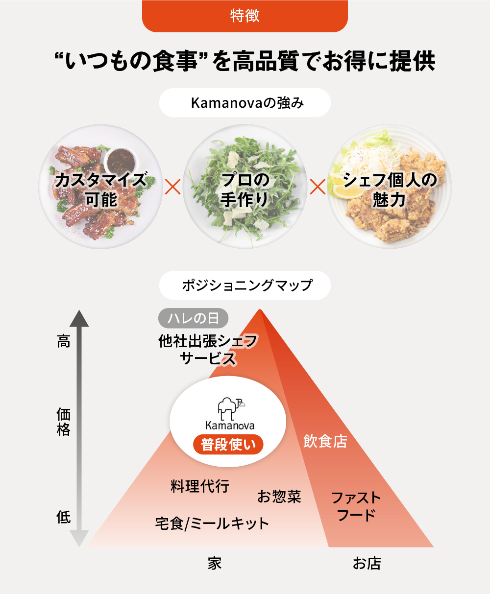 これまでの出張シェフサービスは、お祝い事やホームパーティなどハレの日がメイン需要でしたが、「Kamanova」は毎日の家庭における「いつもの食事」の提供を想定します。大量生産品や冷凍食品の宅配サービスと比較した際には、以下のような優位性があると自負しています。