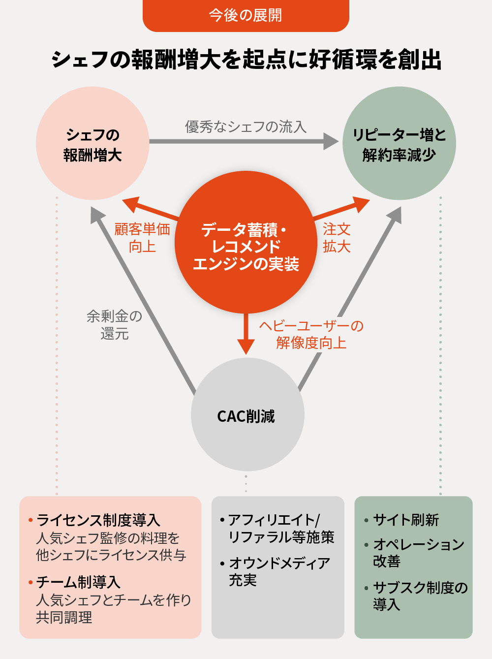 「Kamanova」では、先ずはシェフの報酬増大に注力する方針です。シェフの報酬が増大することで、プラットフォームにより優秀なシェフが流入し、結果として売上高や継続率が向上するとともに、データが蓄積されていくことで、より有効な戦略を打ち出していくことできる、好循環を創出できると認識しています。