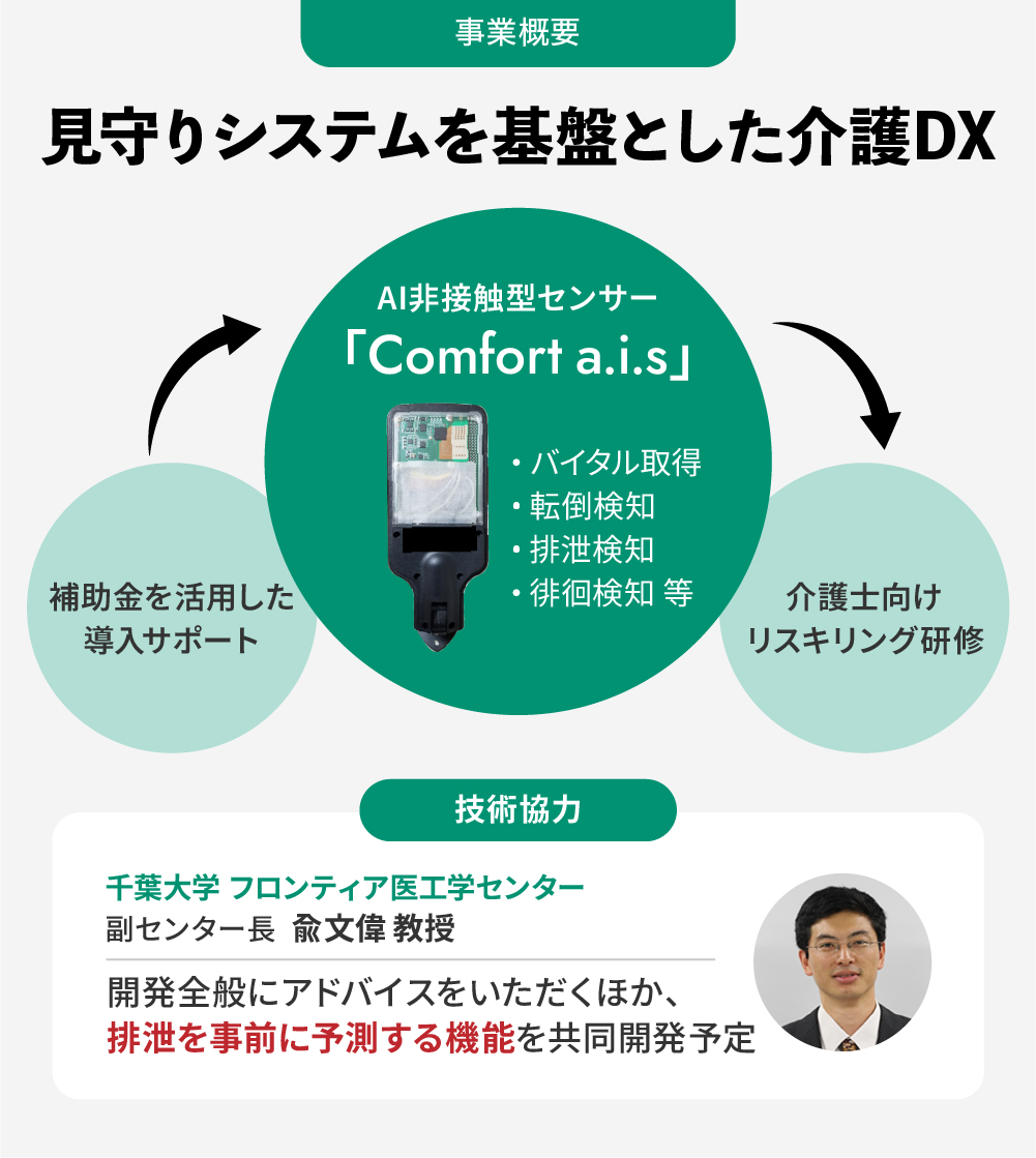 åŒç€Ÿã¯ãä»è·å£«ã䜿ããããæ©èœã ãã«ç¹åããèŠå®ãã·ã¹ãã ãšããŠãéæ¥è§Šåã»ã³ãµãŒãComfort a.i.sïŒã³ã³ãã©ãŒãã¢ã€ãºïŒããéçºããŠããŸãããã®ã·ã¹ãã ã¯ããã€ã¯ãæ³¢æè¡â»ãšAIãçµã¿åãããä»è·ãå¿ èŠãªæ¹ã ã®ãã€ã¿ã«ããŒã¿ããªã¢ã«ã¿ã€ã ã§ååŸããåæããããšãå¯èœã§ãã