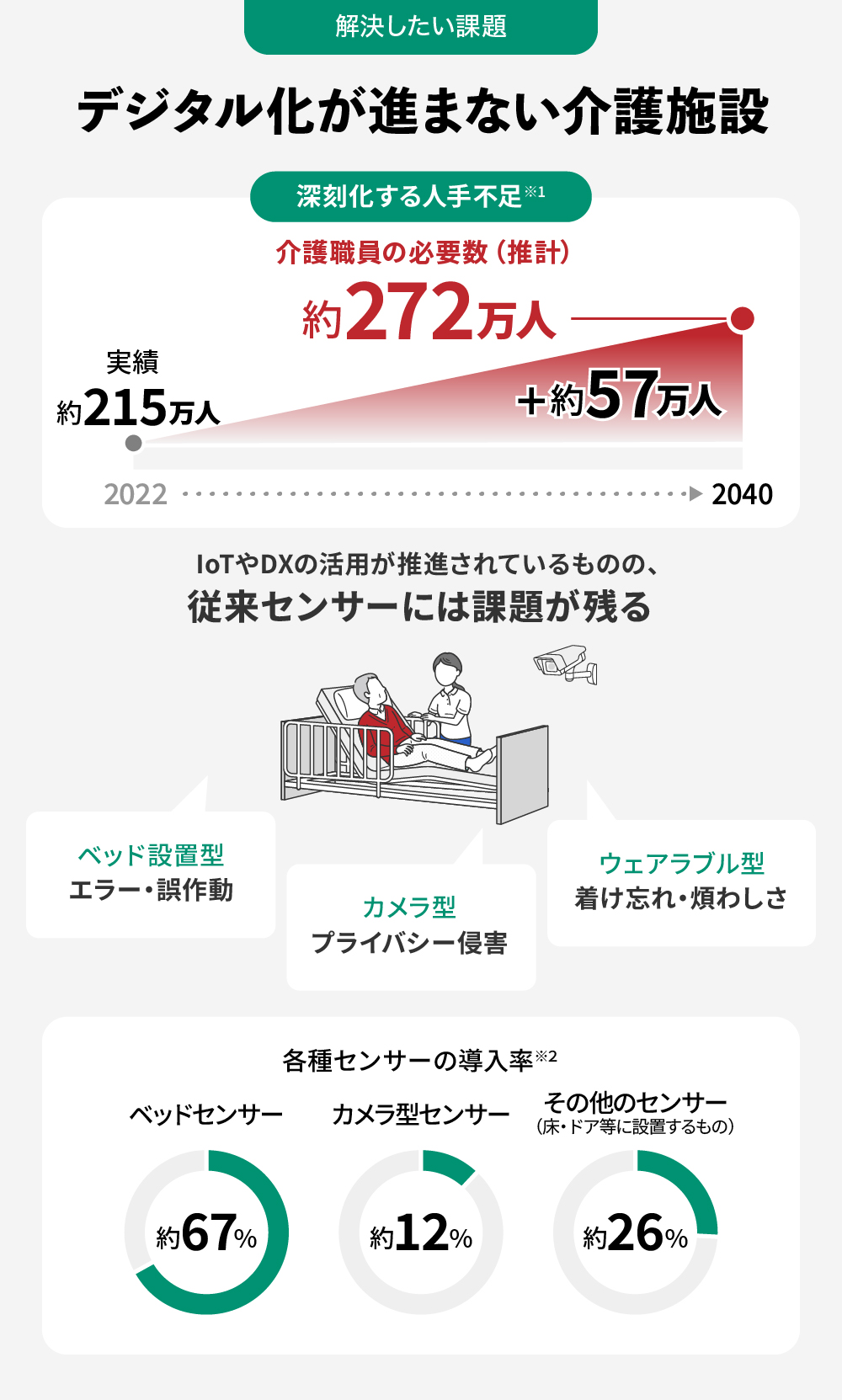 å ããŠããããäžã§ã®äœéç§»åã»å¯è¿ãã ãã§ã»ã³ãµãŒã誀äœåããäžèŠãªã¢ã©ãŒã ã鳎ããªã©ãä¿¡é Œæ§ã®é¢ã§ã課é¡ããããŸããéããã人æ°ã§ã现å¿ã®æ³šæãæããªããé«éœ¢è ã®å®å¿ã»å®å šãå®ããªããã°ãªããŸããããã·ã¹ãã ã®é²åã®é ãã«ãã£ãŠä»è·ã¹ã¿ããã®èäœçã»ç²Ÿç¥çè² æ ããã倧ããªãã®ãšããŠããŸãã