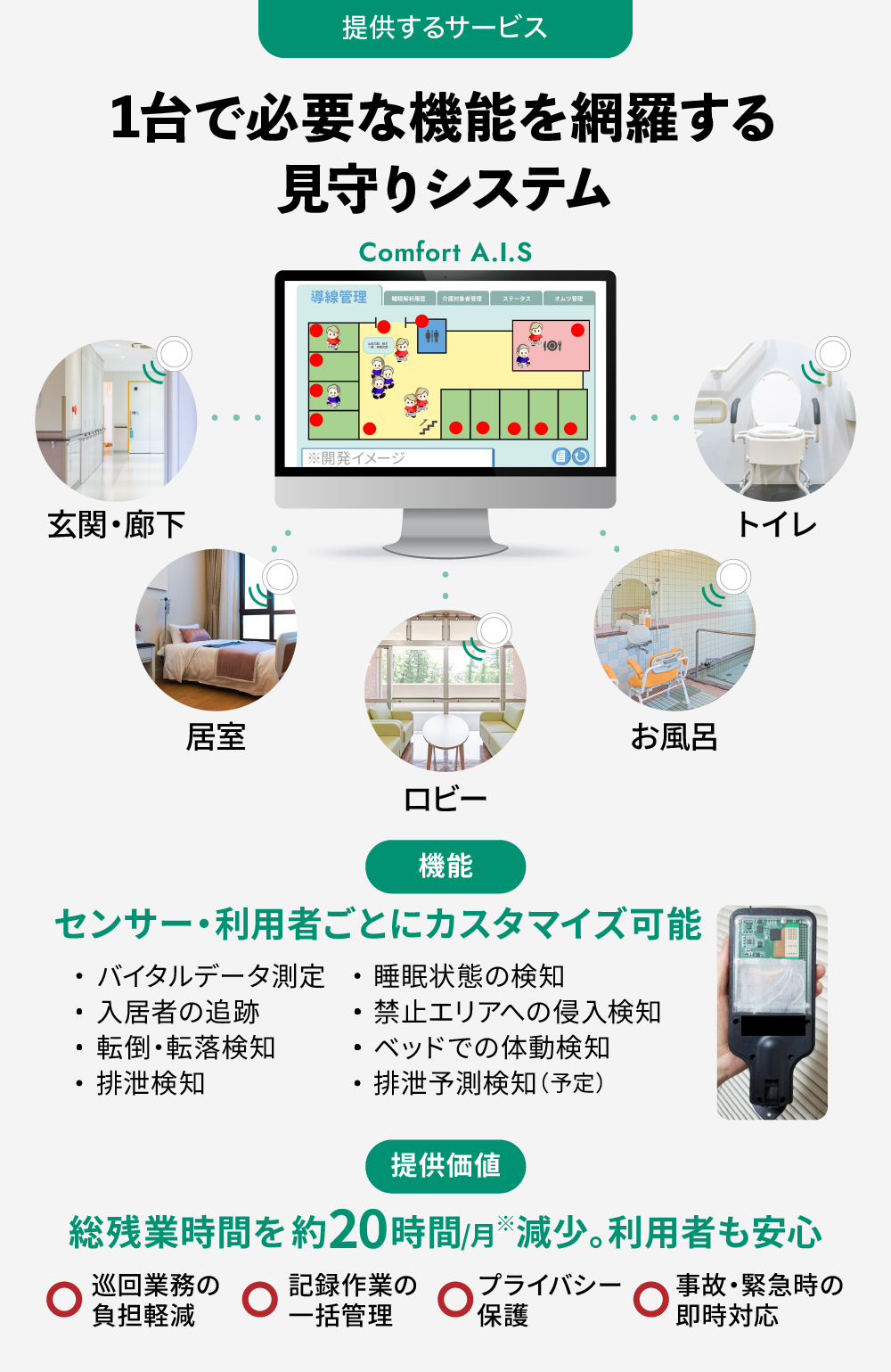 ãŸããè€æ°ã®å©çšè ãåæã«ã¢ãã¿ãªã³ã°ããæœèšå šäœã®èŠå®ããå¯èœã§ãä»è·å£«ã®ç®ã«é Œããªã24æéã®èŠå®ããå®çŸããŸããããã«ãAIã«ããããŒã¿åæãšç°åžžæ€ç¥ãäœçšãããããšã§ã転åãåŸåŸã®ãªã¹ã¯ãäœæžããŸããå ããŠãææ³ã±ã¢ã®é©åãªã¿ã€ãã³ã°ãææ¡ããæ©èœã远å ãããªã©ãä»è·èšé²ã®èªååã«ãè²¢ç®ããŸãã