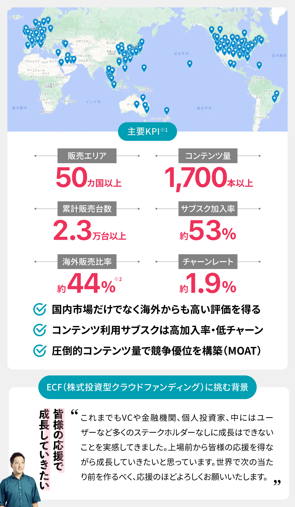 すでに海外でも認知度を得て、売上獲得出来ている点、売り切りモデルだけではなく、月額の動画SaaS売上についても高い継続率が得られている点から投資を決めさせていただきました。