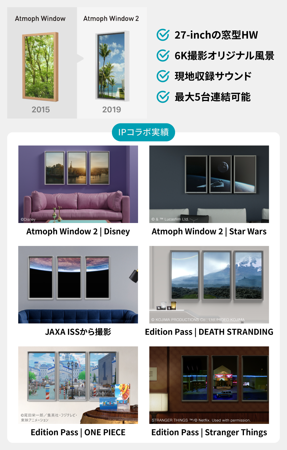 2015年の第1世代から2019年の第2世代までは世界の風景を鑑賞することを主目的としてきましたが、第3世代となる「Atmoph Window Yo」より、エンタメ性を備えた次ステージへと移行します。