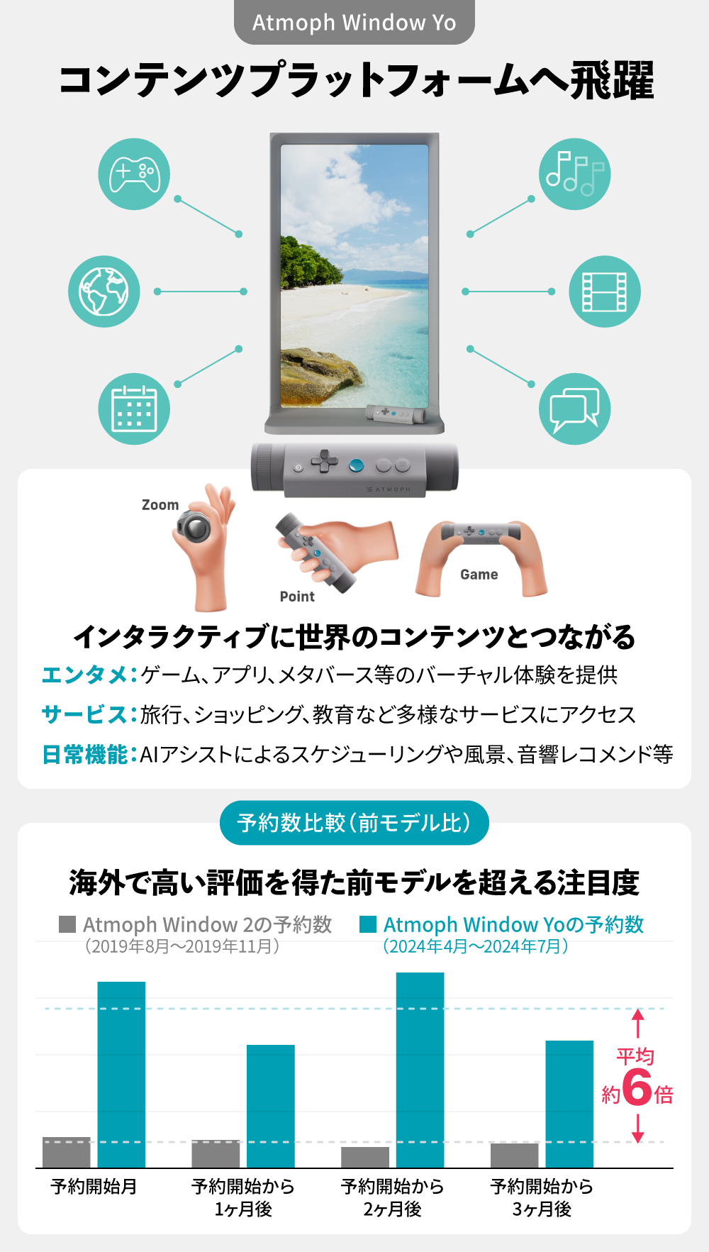新製品「Atmoph Window Yo」の製造と出荷を開始し、一般販売を広げています。海外での販売比率が現在約38%なのを、今期は45%まで引き上げる計画です。機能面では、世界で1,000万ダウンロードされたゲームアプリを全台に搭載予定です。