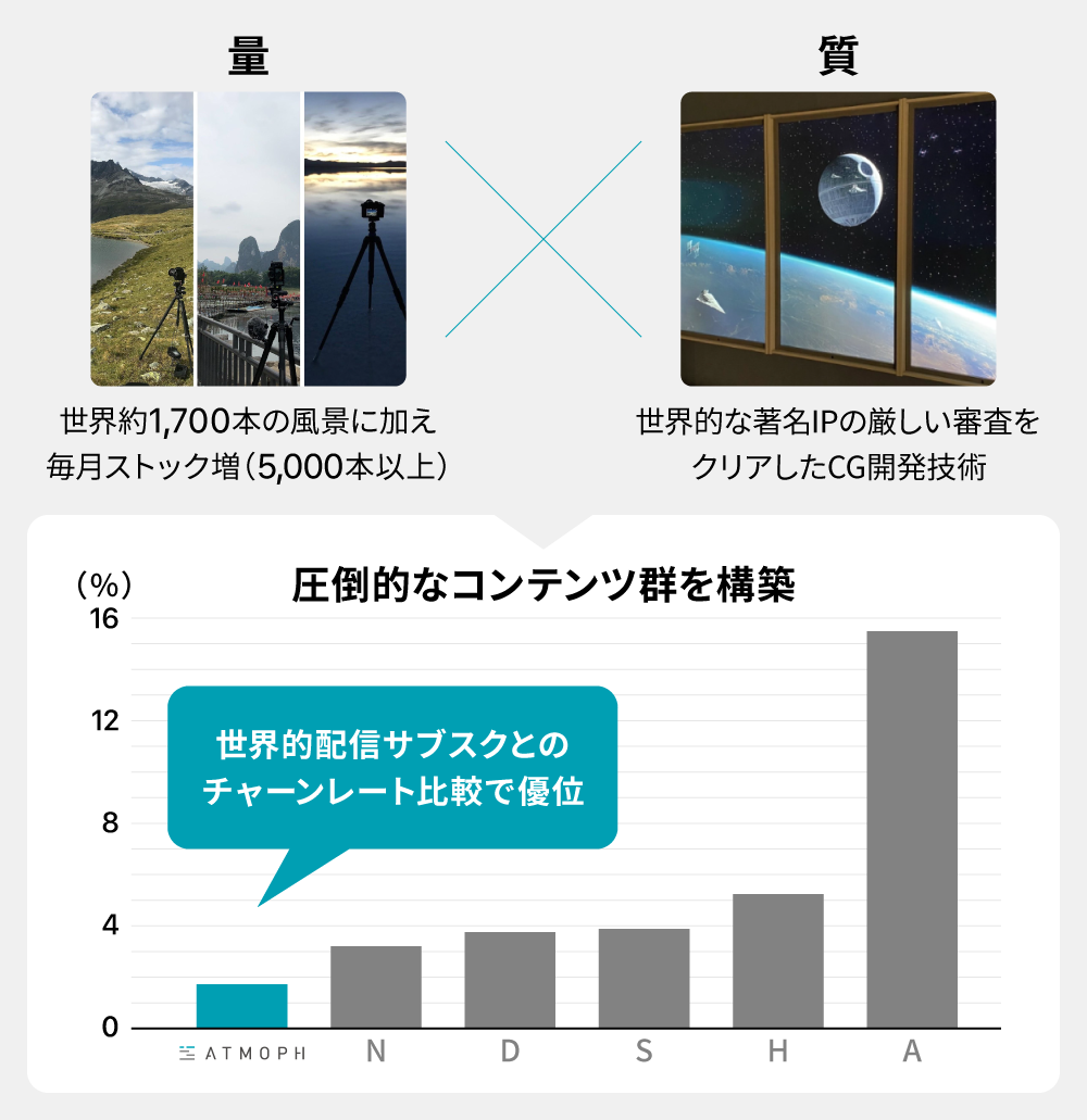 映像コンテンツは、自社で撮影・編集した1,700本以上の世界各地の風景動画で構成され、他社の追随を許さないMOAT※を構築できていると自負しています。