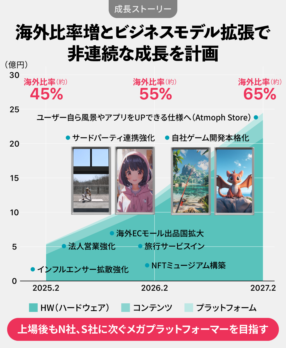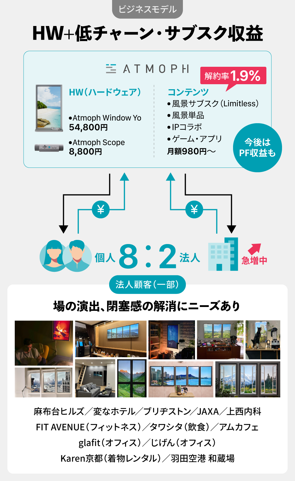 また、「Atmoph Window Yo」より、ゲーム、旅行、EC、広告、健康など多様なジャンルのサービスを展開するプラットフォームへと拡張することで、HW販売、サブスクに次ぐ安定収益源としていく計画です。
