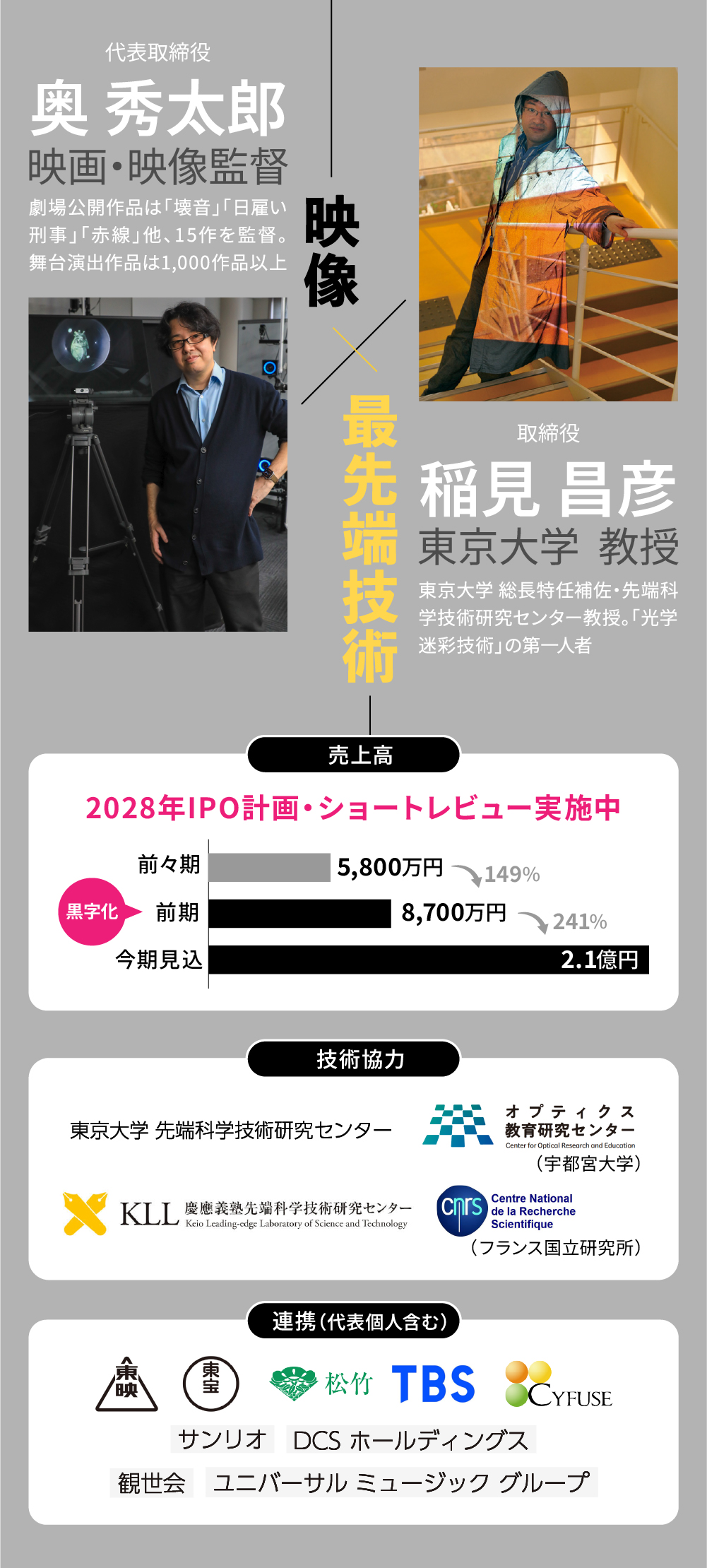 æ ç»ç£ç£ãæ åäœå®¶ãšããŠ1,000ãè¶ ããäœåã«åå ãã代衚åç· åœ¹ã®å¥¥ ç§å€ªéãšãæ±äº¬å€§åŠã®å 端ç§åŠæè¡ç ç©¶ã»ã³ã¿ãŒã§ãå åŠè¿·åœ©æè¡ããç ç©¶ããåç· åœ¹ã®çš²èŠ æåœŠããããŠãVRãæ åçŸè¡ã®æ·±ãç¥èŠãæã€ããŒã ã¡ã³ããŒã§äºæ¥ã«æã¿ãŸããIPOãžåããã·ã§ãŒãã¬ãã¥ãŒã宿œäžã§ããªã¢ã«ç©ºéã«ã倢ããäœãåºãããããªå€¢ãäžç·ã«çŽ¡ãã§ããã仲éãã€ãããããä»ååéããããŠããã ããŸããã