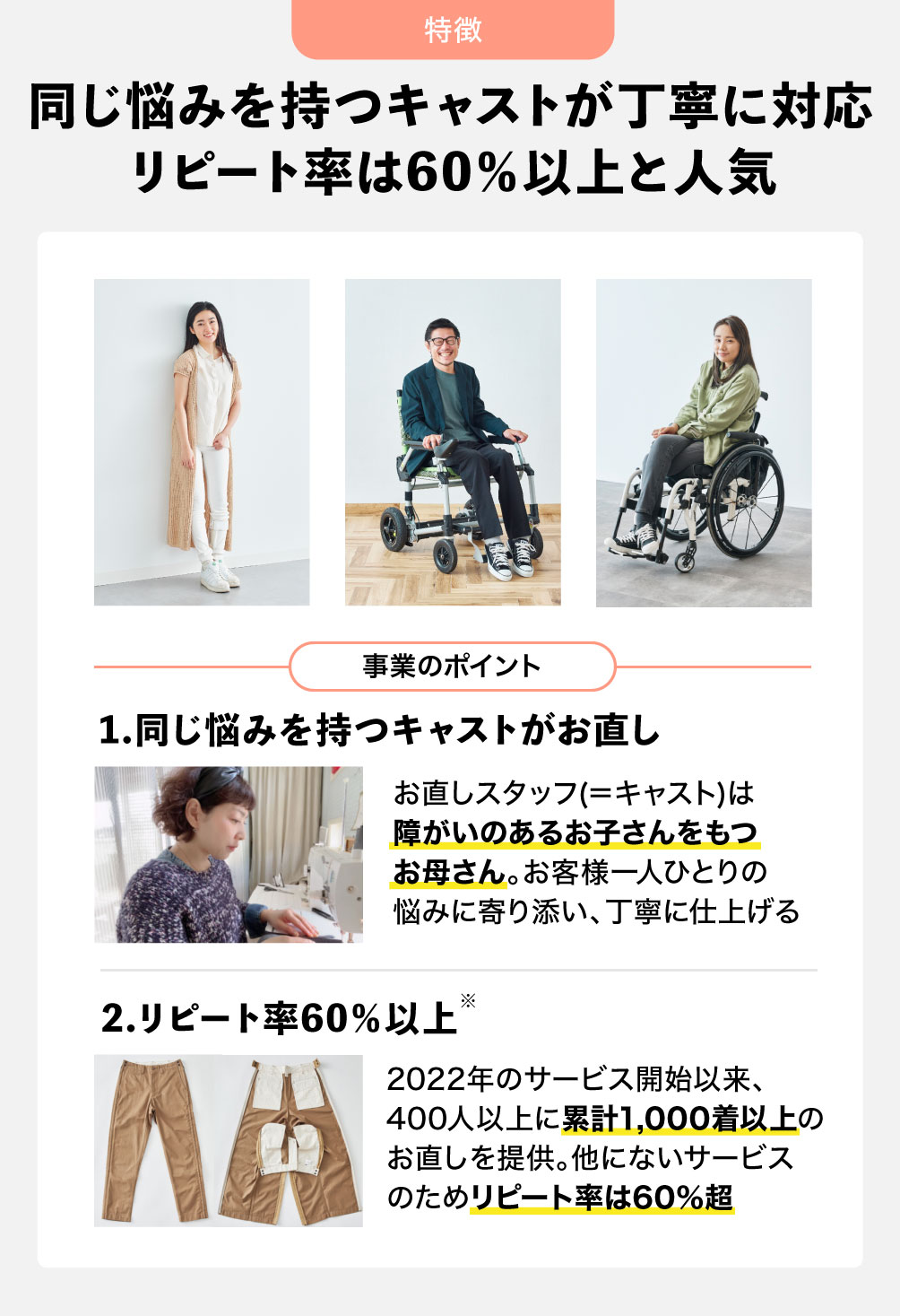 また、接客からお直し作業までを在宅フルリモートで行うキャストは現在15名在籍しており、その多くが障がいのあるお子さんを持つお母さんです。お客様と同じ悩みや経験を持つキャストが、目の前のお客様一人ひとりに合わせてお直しする服はどれも、お客様の想いとキャストの優しさがつまった「世界に1着だけ服」です。