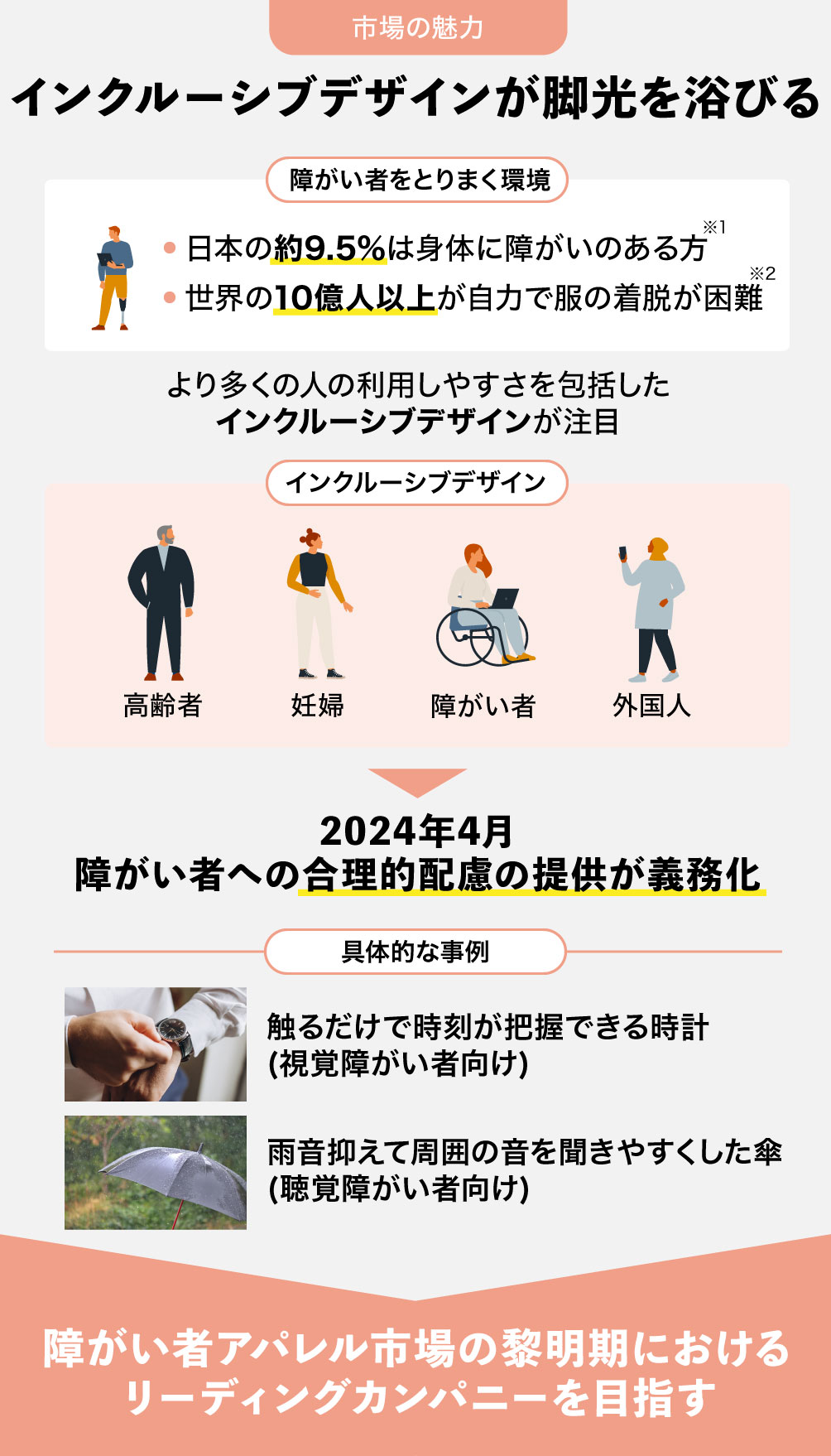 加えて、超高齢化社会に突入した日本では、加齢によって不自由を抱える人も年々増えており、今後アパレルブランドが継続的に成長し続けるために、様々な不自由を抱える方々への適切な配慮が重要な経営課題の一つになっていくと考えています。