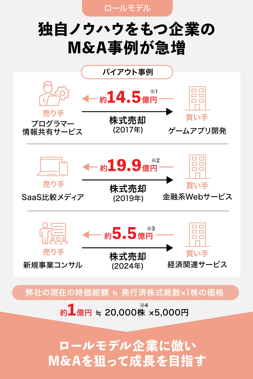 弊社は上記のロールモデル企業と同様、業界に特化したコミュニティや新規事業開発に活かせるノウハウを保有していると自負しており、M&Aを狙って成長していきたいと考えています。