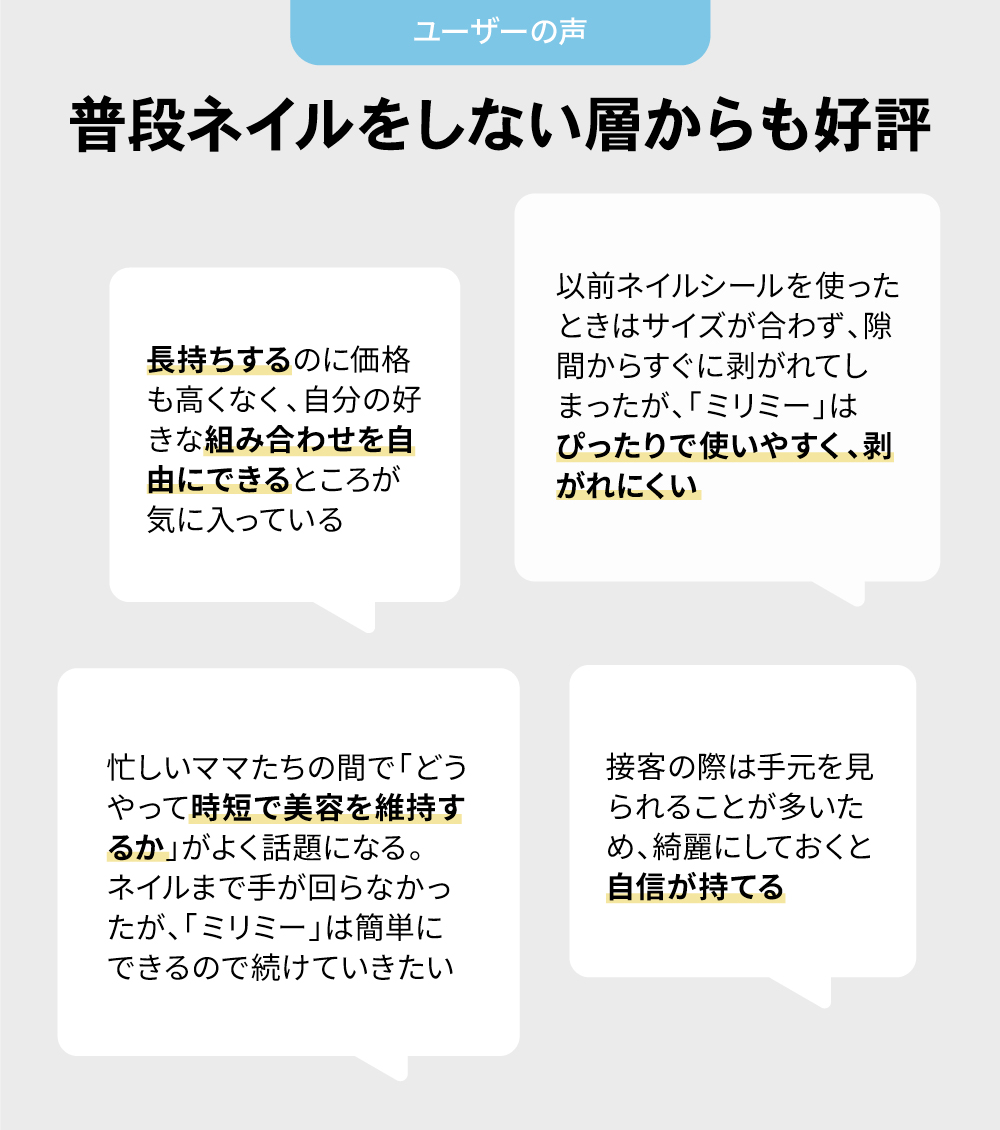 ãããªããŒãã®æå€§ã®ç¹åŸŽã¯ããèªåã®çªã®ãµã€ãºã«åãããŠã«ããããå¿ èŠããªããç¹ã§ããé£ããæè¡ã¯äžèŠã§ã貌ã£ãåŸã«UV/LED ã©ã³ãã§åºããã ãã®ããã5åã»ã©ã§å®æãããããå¿ãã20ã40代ã®ããäžä»£ã§ãæ¬æ Œçãªãã€ã«ã楜ãããŸãã