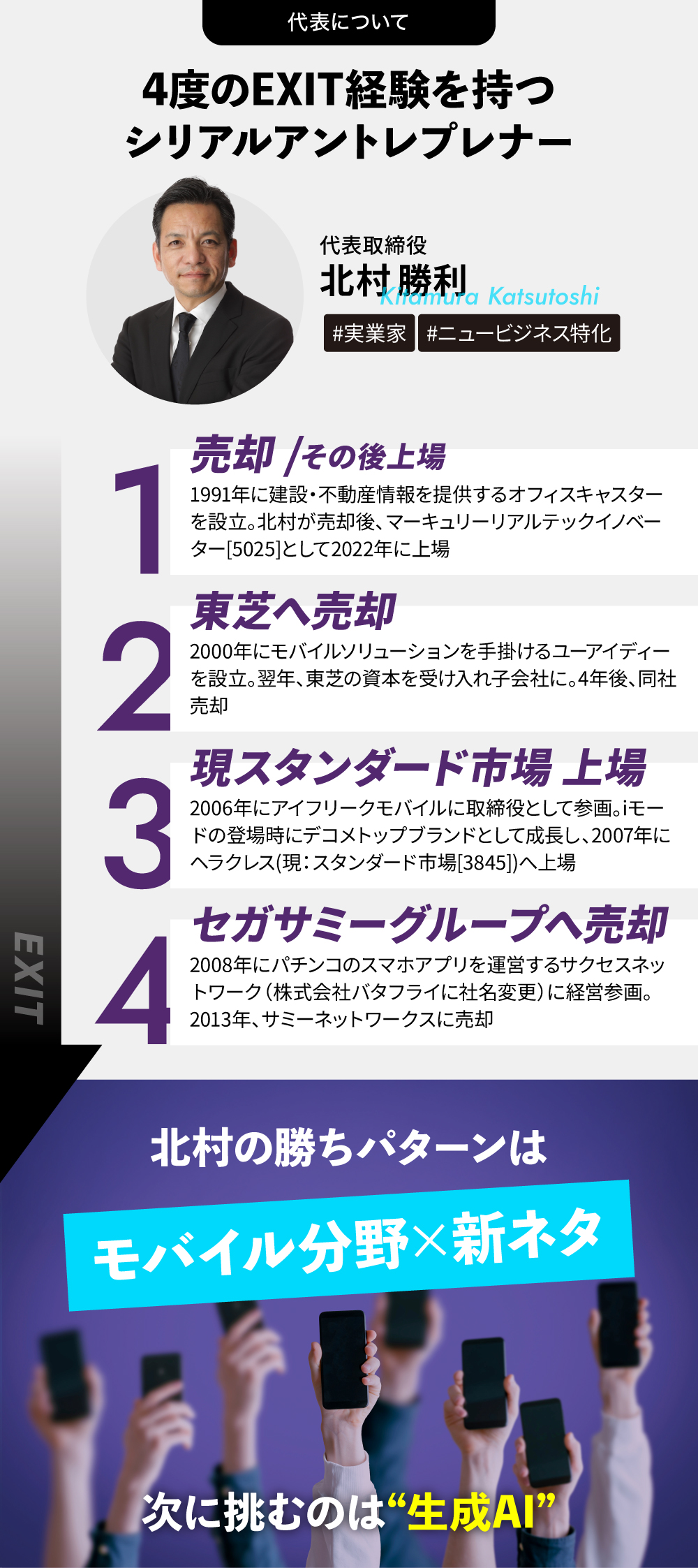 弊社代表の北村は、ベンチャー経営者として4度のエグジットを経験したシリアルアントレプレナー(連続的に新しい事業を立ち上げる起業家)です。