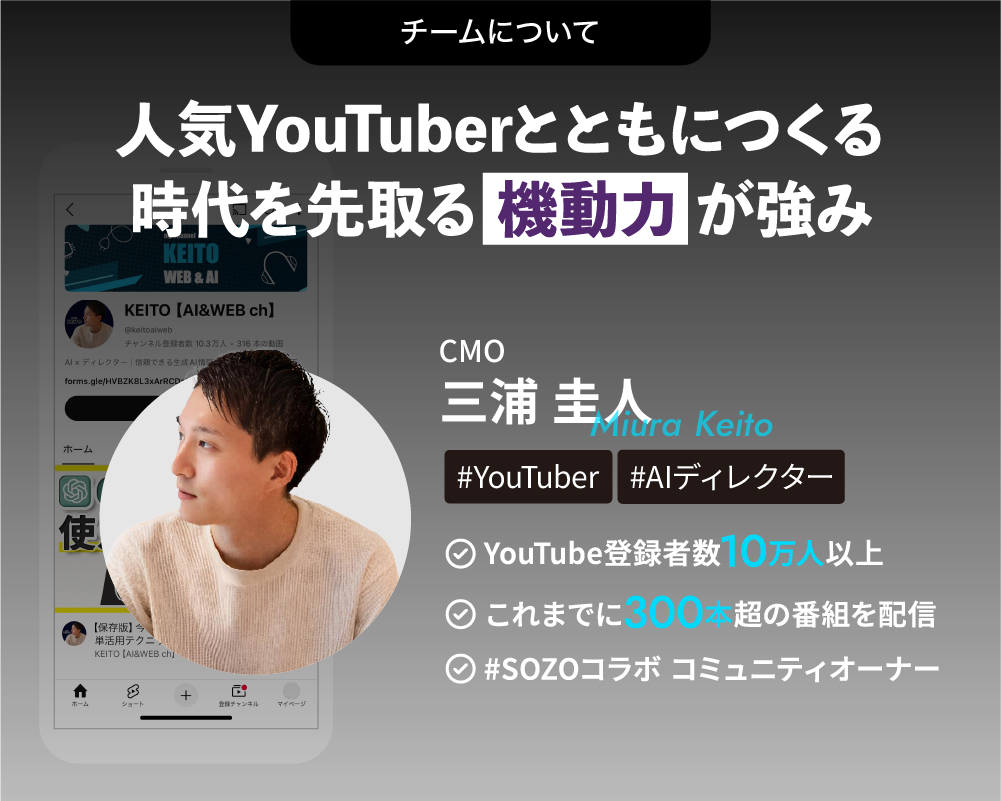 生成AIのインフルエンサーとして抜群の知名度を持つ三浦圭人がCMOを務めていることが事業拡大への効果を発揮しています。三浦は生成AIの活用方法や、新しいツール等を紹介する登録者数10万人超のYouTuber『KEITO』として活動しており、AIにまつわる最新情報をキャッチアップする上で欠かせない人物です。