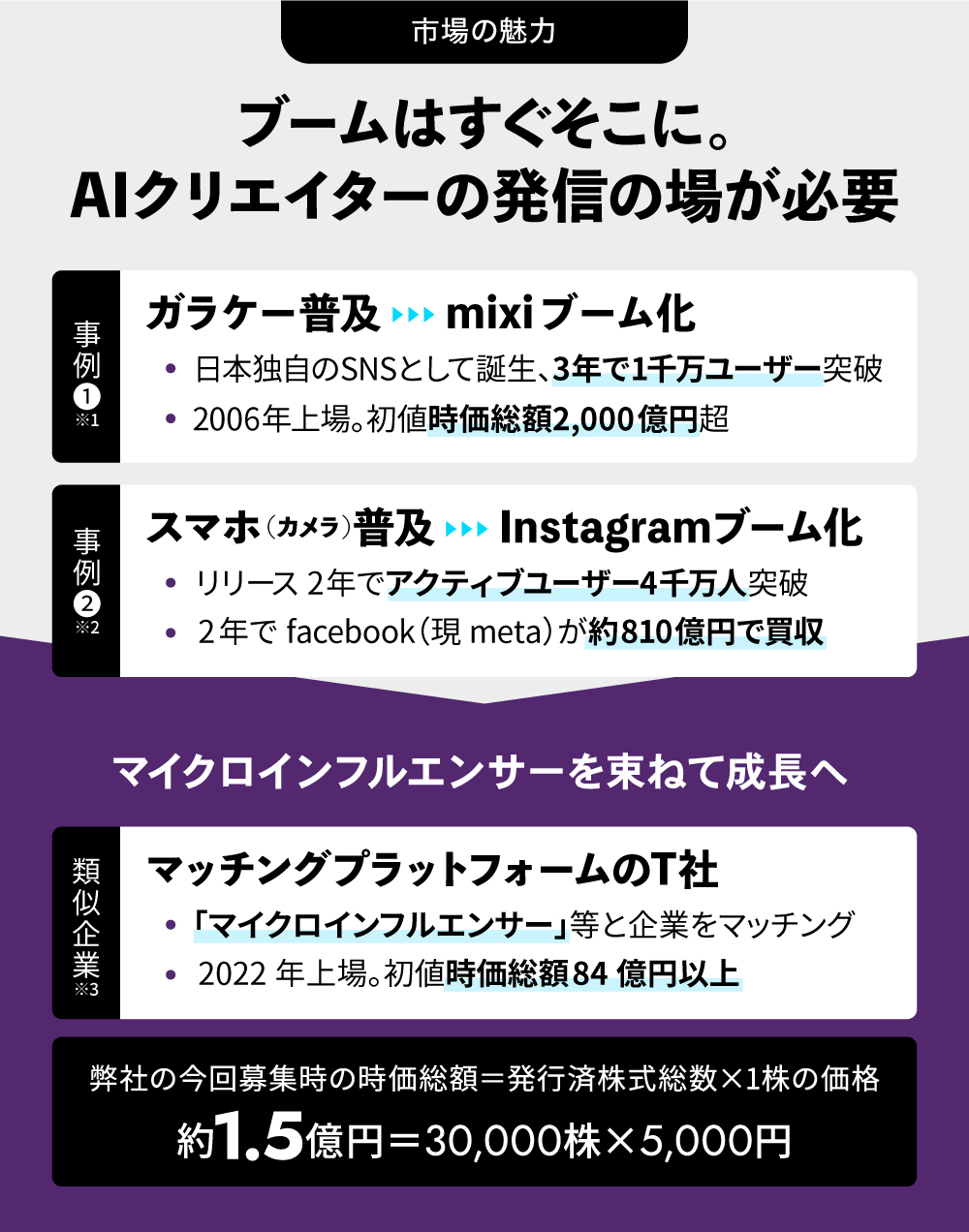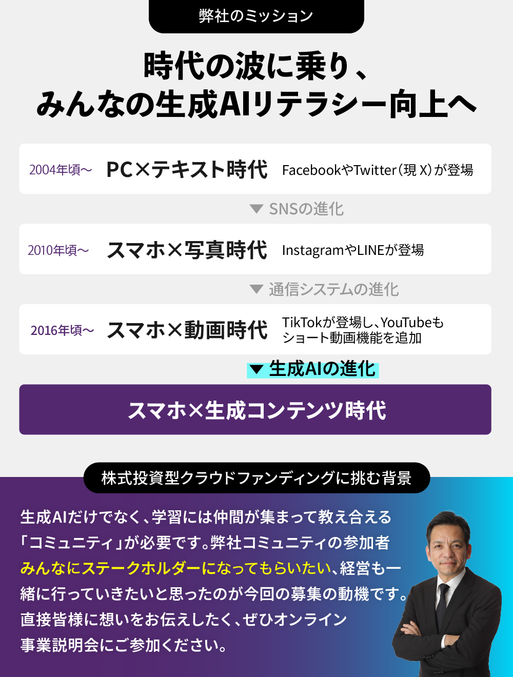 このような数十年に1度の「プラットフォームシフト」の波に乗り、大手企業では実現することが難しいスピード感で事業展開を進めてまいります。