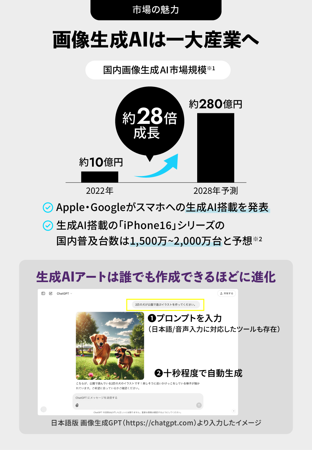 生成AI市場全体は、10年以内に180兆円に拡大するとも言われる成長分野です※。また、日本の画像生成AI市場は2028年までに約280億円規模に成長するという調査もあります。弊社では、生成AIが標準装備されている「iPhone16」シリーズの今後3年間での日本における普及台数予想は1,500万〜2,000万台程度と予測しています。生成AIツール「Gemini」が標準搭載された「Google Pixel 9」の登場も相まって、2025年以降「スマホAI」ムーブメントが加速すると予想しています。