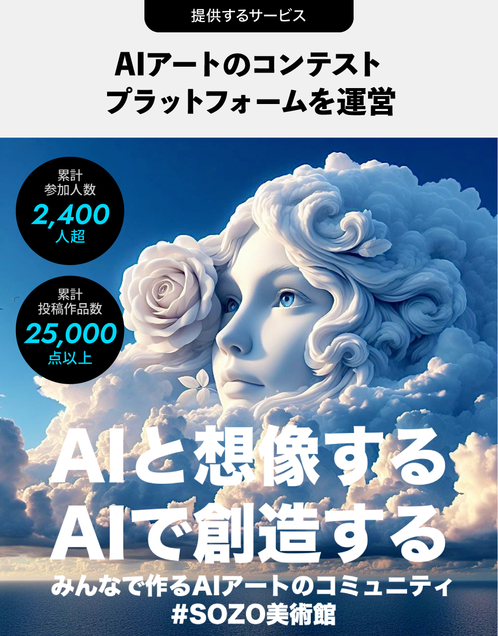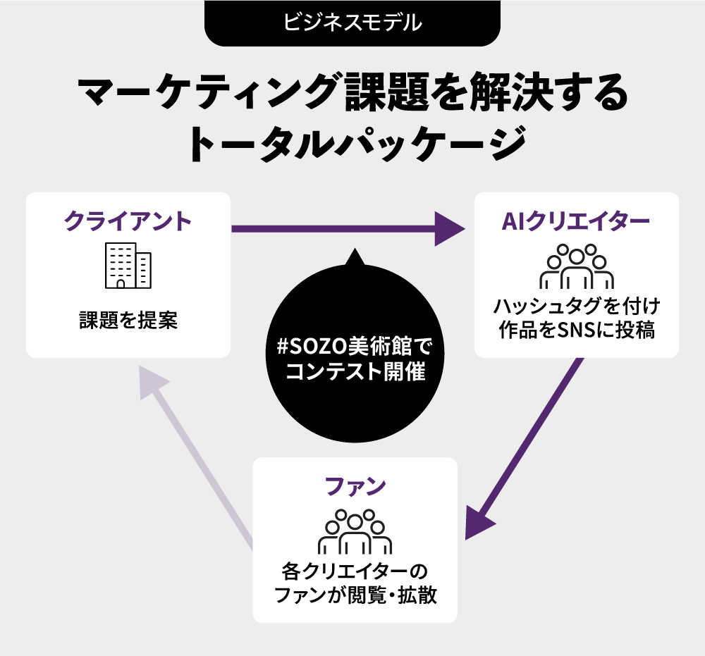 「#SOZOコラボ」に参加する一般の生成AIクリエイターの力を活用して、AIアートのコンテストプラットフォーム「#SOZO美術館」も展開しています。これは特定のテーマのもと、AIアートを様々な人から募集してコンテストを開催し、そこにクライアントを募ることで運営として収益を得るものです。