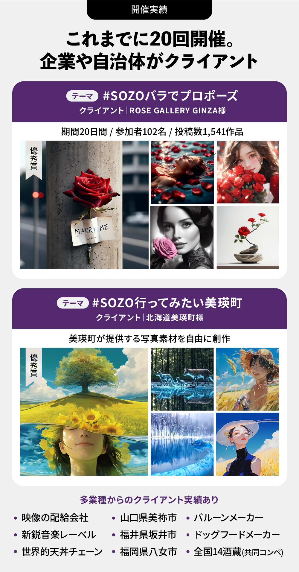 リリース当初から、多くの企業や自治体にクライアントになっていただいており、製品や地域の認知度を高めるプロモーションに繋がっています。テーマを設定し、弊社が運営するコミュニティ「#SOZOコラボ」の参加者を中心に作品を募り、グランプリ獲得者にはクライアントが作品を使用する名誉や、賞金などが与えられます。