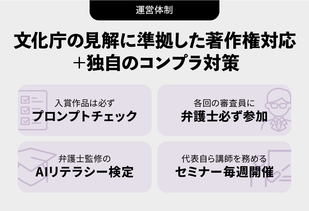 黎明期であるAIアートに対して、文化庁の見解に準じながら著作権対応を含むコンプライアンス対策も徹底して行っています。