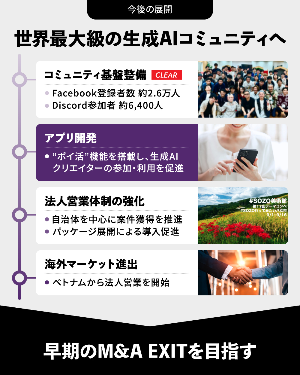 2030年4月期には、M&AによるEXITを計画しています。売却先イメージは生成AI関連というよりは、教育、人材系(生成AI人材の求人)やフリーランス関連、ポイ活系など、異業種でスマートフォン+生成AIとの親和性の高い会社が潜在的な候補ではないかと考えています。