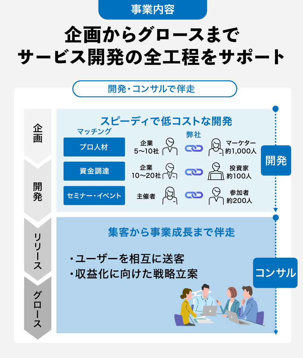 ããã«ãããã¢ã€ãã¢ããŸã æŒ ç¶ãšããŠããæ®µéãããäºæ¥è ã®ããžã§ã³ã«åºã¥ããå ·äœçãªãããã³ã°ãµãŒãã¹ã®èšèšã»éçºãæ¯æŽãããµãŒãã¹ã圢ã«ãªã£ãåŸã¯åçåã«åããæŠç¥ç«æ¡ããéå¶ãµããŒããŸã§äžæ°é貫ã§ãµããŒãããŸãã