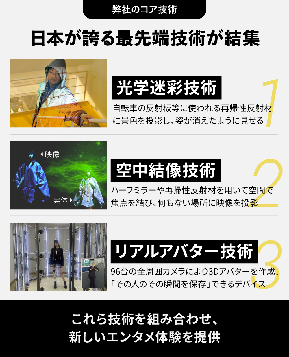 上演中止、延期、降板、休演など数多の苦難を乗り越える中、稲見先生の「人類の電脳化が一気に進んだ」という逆転の発想を旨に国内外の研究機関とのネットワークを強化し、更なる空中結像装置やAI、センサー技術を駆使したVRゴーグルに変わるデバイスを開発。エンターテインメント、エデュケーション、ヘルスケアの各分野で人類の未来を加速させるファンタジスタでありたいと誓う。