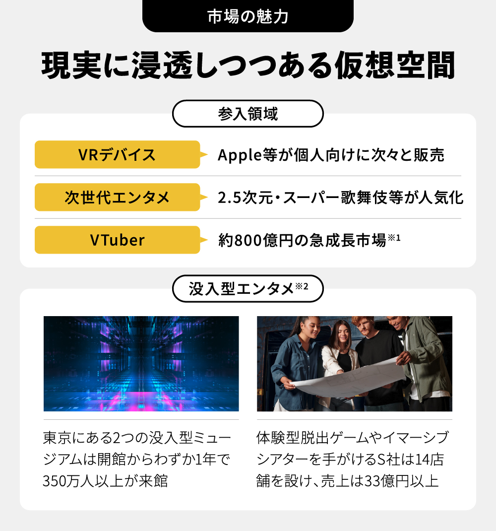 弊社は上記のような新しい表現形態に技術を提供できる他、市場規模約800億円(2023年見込)とされるVTuber業界とも親和性が高いと考えています。