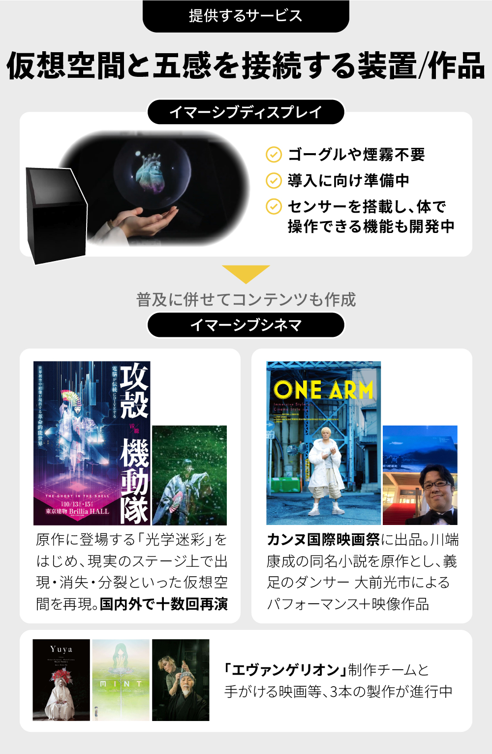 カンヌ国際映画祭に出品した「ONE ARM」をはじめとする映像作品「イマーシブシネマ」も制作しており、他にも複数の映画制作が始まっています。