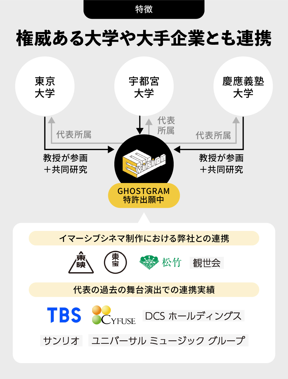 研究機関との連携や特許による技術力の高さと、長年映像制作に携わってきた代表のネットワークやクリエイターとしての実力。技術面とコンテンツ面の両方を活かして事業に取り組んでまいります。