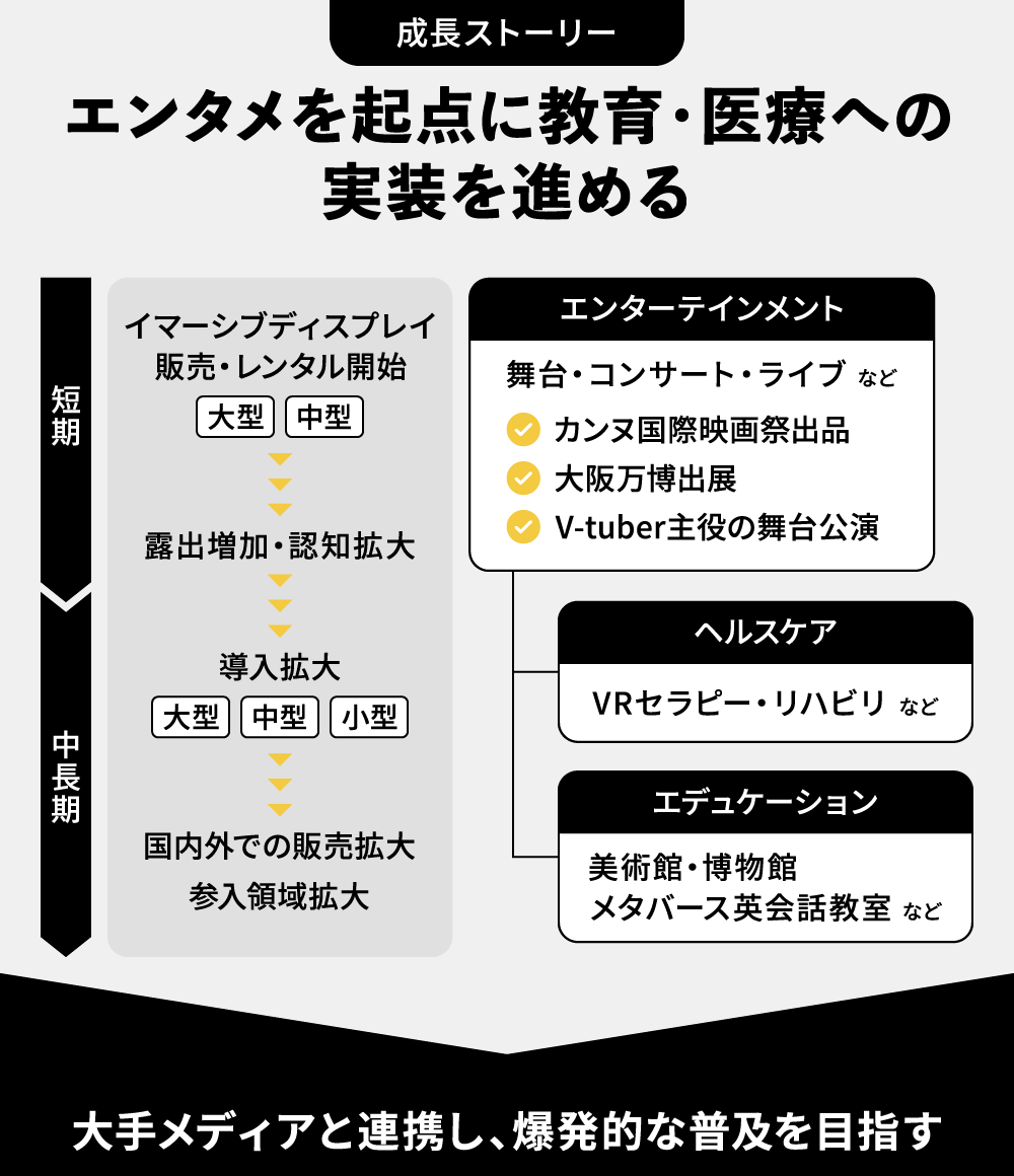 エンタメ業界で一定の認知とシェアを獲得した後は、エデュケーションやヘルスケア分野にも「イマーシブディスプレイ」の活用を拡大します。