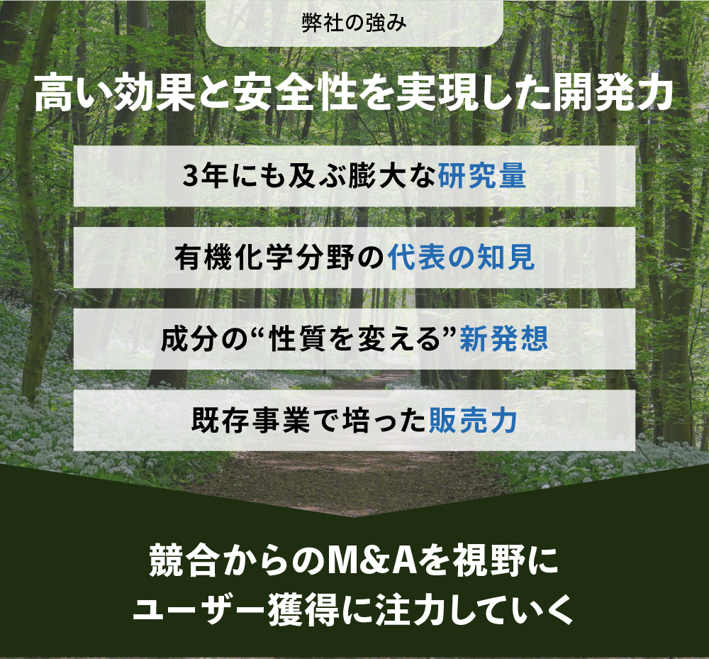 æåãåè§£ãããæ®ºèããã®ã§ã¯ãªãããæ§è³ªãå€ããããšããæ°çºæ³ã«åºã¥ããŠãããã®æ¶èæè¡ã¯ãåŒç€Ÿã®ã³ã¢ã³ã³ãã¿ã³ã¹â»2ã§ãããå°æ¥çã«ã¯M&Aãç®æããŠããŸãã