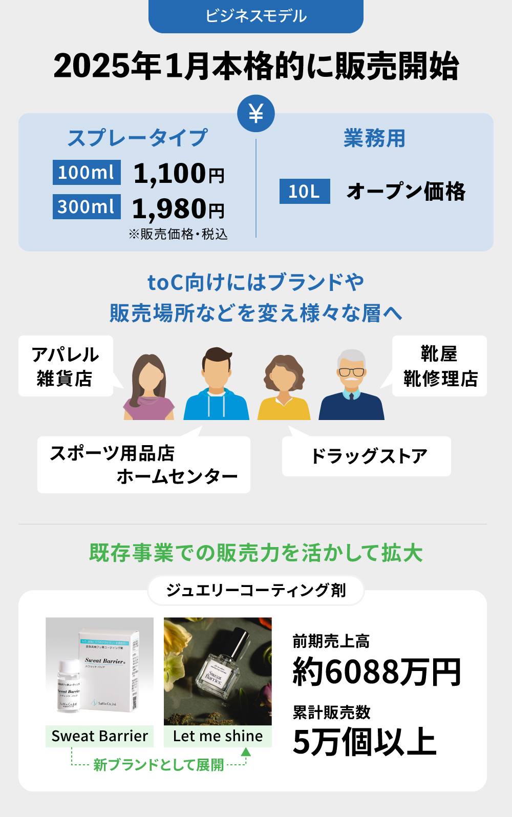 ãŸãã¯ãã¹ããŒãçšååºãéŽçšååºã察象ã«ããåžè²©å£²ã§é¢å±éãé²ããŠããŸããçŸåšã¯é·éçãæ ç¹ãšããéŽã®å€§åå°éåºãã·ã¥ãŒããŒãããçå± ã©ã³ããŒçãå©çšããæž©æµŽæœèšãRe.Ra.Kuãã§ãã¹ã販売ãéå§ããŠããã2025幎以éã«ã¯ãã€ã³ã»ã¹ããŒãæ ªåŒäŒç€ŸããŒããæ ªåŒäŒç€Ÿãéããå šåœã®ã¹ããŒãçšååºã«ãŠå€§ããå±éãé²ããŠããèšç»ã§ãã