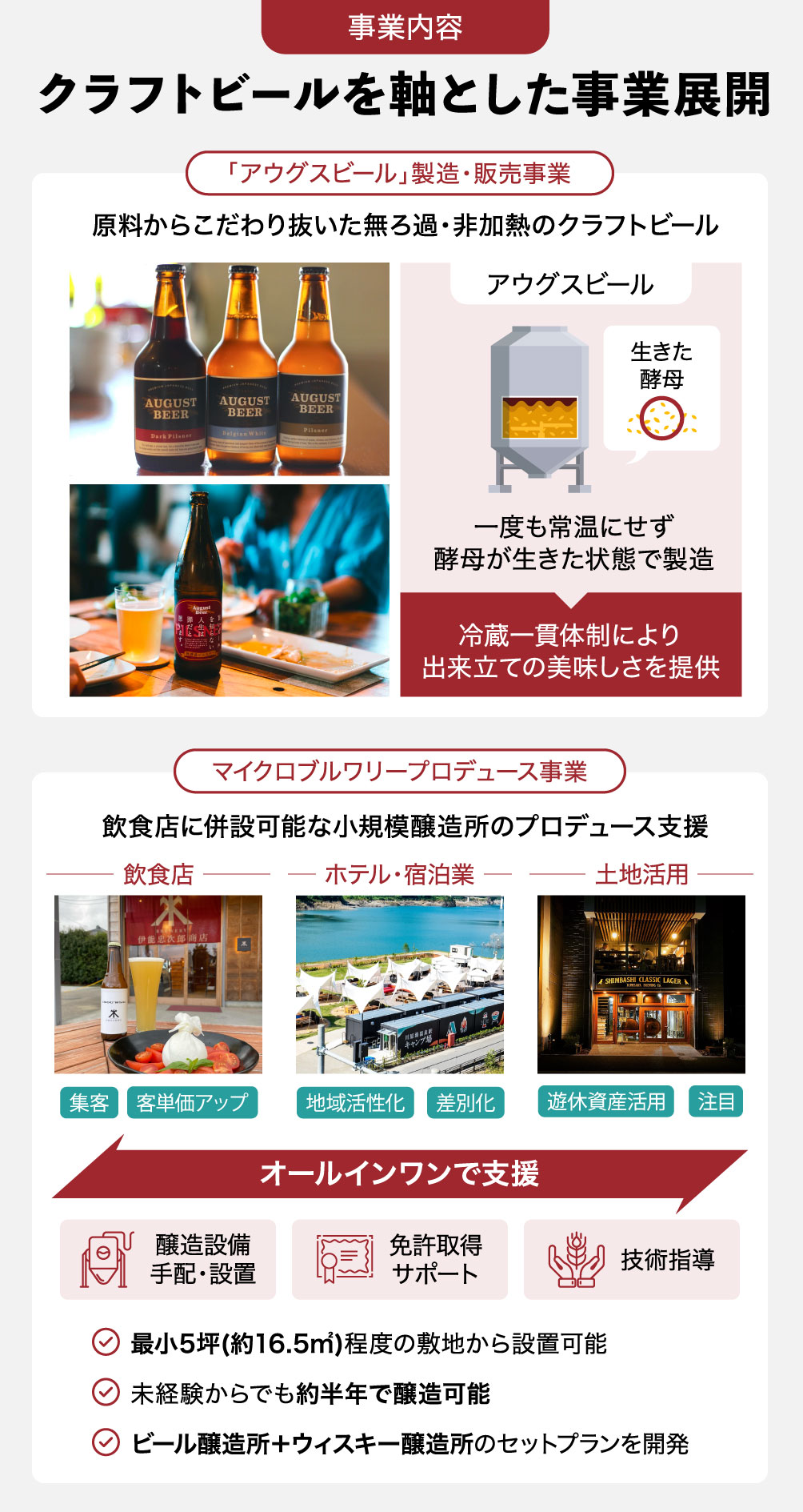 1つ目の事業として、オリジナルの美味しいクラフトビールを消費者に提供する「アウグスビール」製造・販売事業を行なっています。
