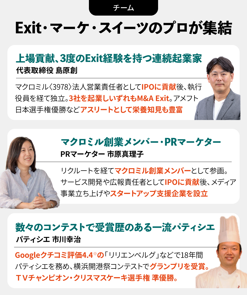 本事業チームには、google口コミ評価4.4(2025年1月28日時点)の有名菓子店「リリエンベルグ」などでパティシエの経験を積んだ市川、マクロミル創業メンバーとしてサービス開発から広報、ブランディング責任者としてIPOに貢献したことのある市原など、多様な専門性を持つ人材が集結。BtoB事業での豊富な成功体験を活かし、食の新たな市場を開拓します。