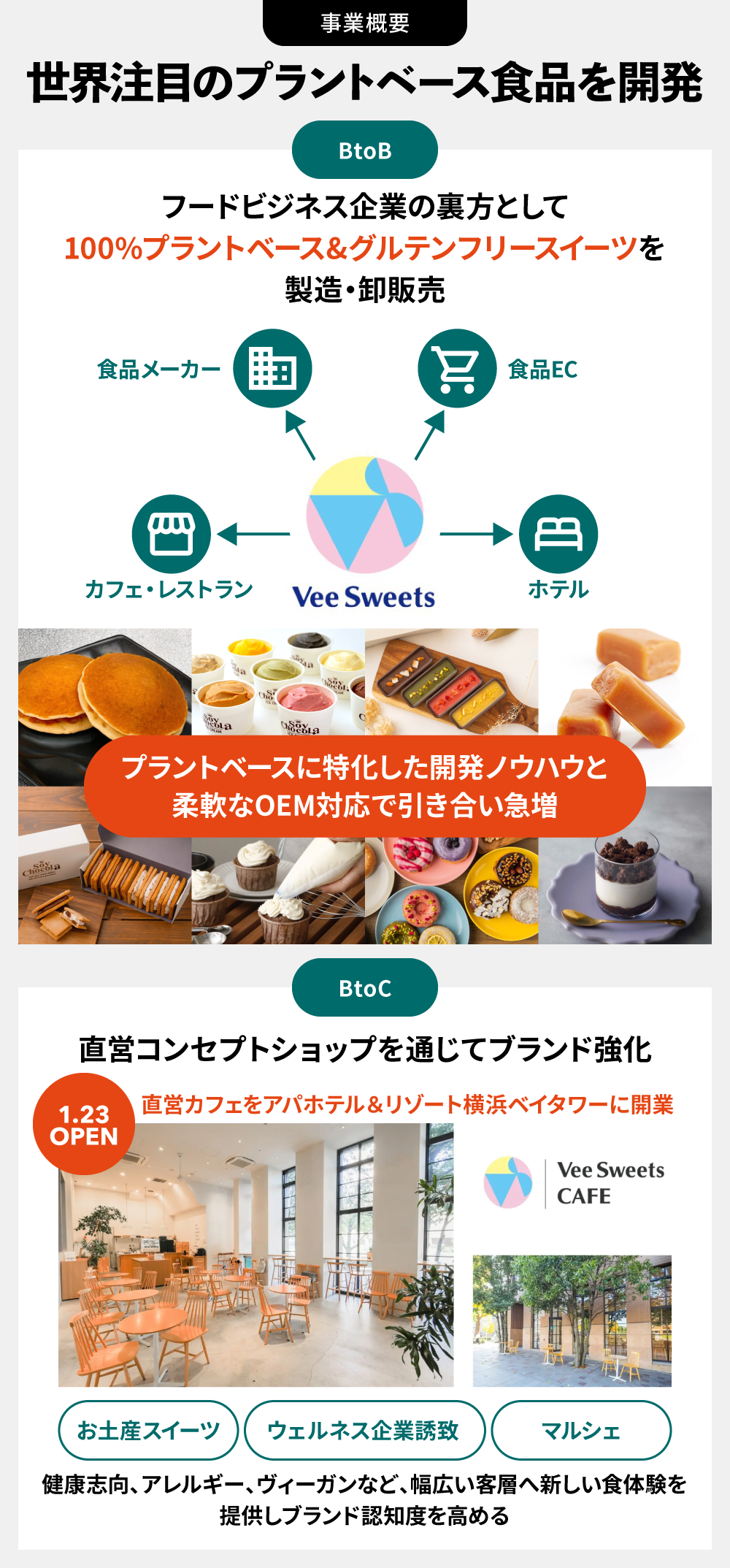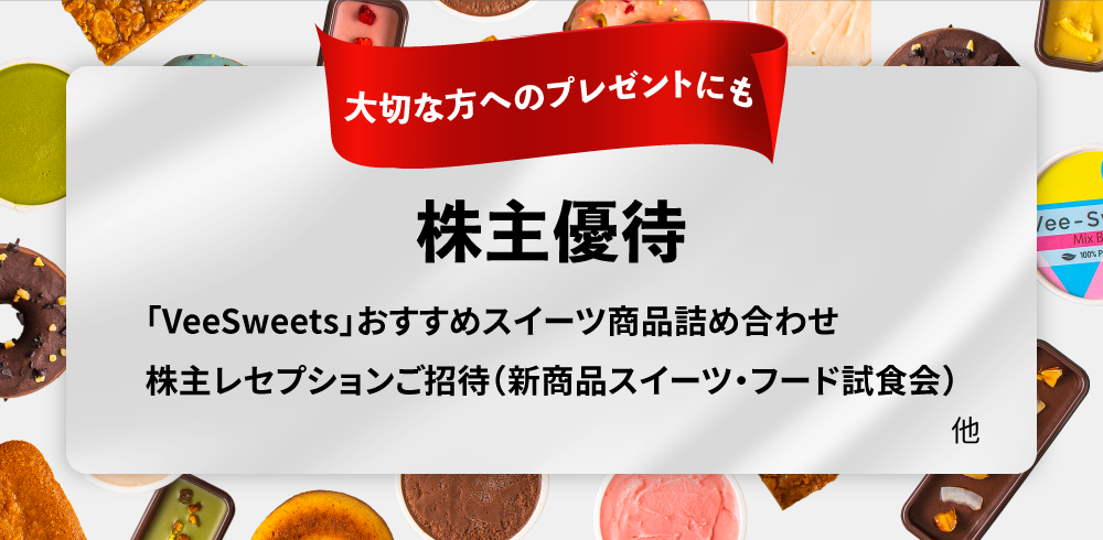 プラントベーススイーツブランド「VeeSweet」の直営カフェ(横浜)にて開催される株主day「レセプション&スイーツ・フード試食会」のご招待および、割引クーポン、株保有数に応じてのスイーツセットのご提供をいたします。詳しくはこちらからご確認ください。