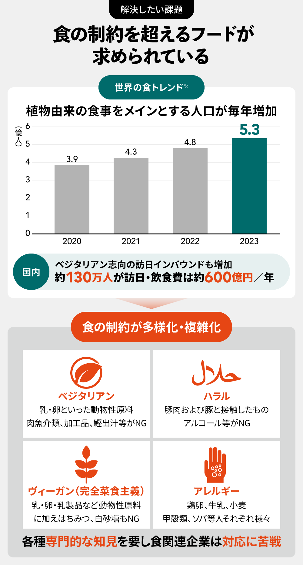 ベジタリアン、ヴィーガン、ハラル、アレルギー…。現代において、食の多様性はかつてないほど広がりを見せています。その様な中、レストランやカフェなどの飲食店は、様々な食のニーズに対応する必要性に迫られ、 メニュー開発やオペレーションに頭を悩ませています。