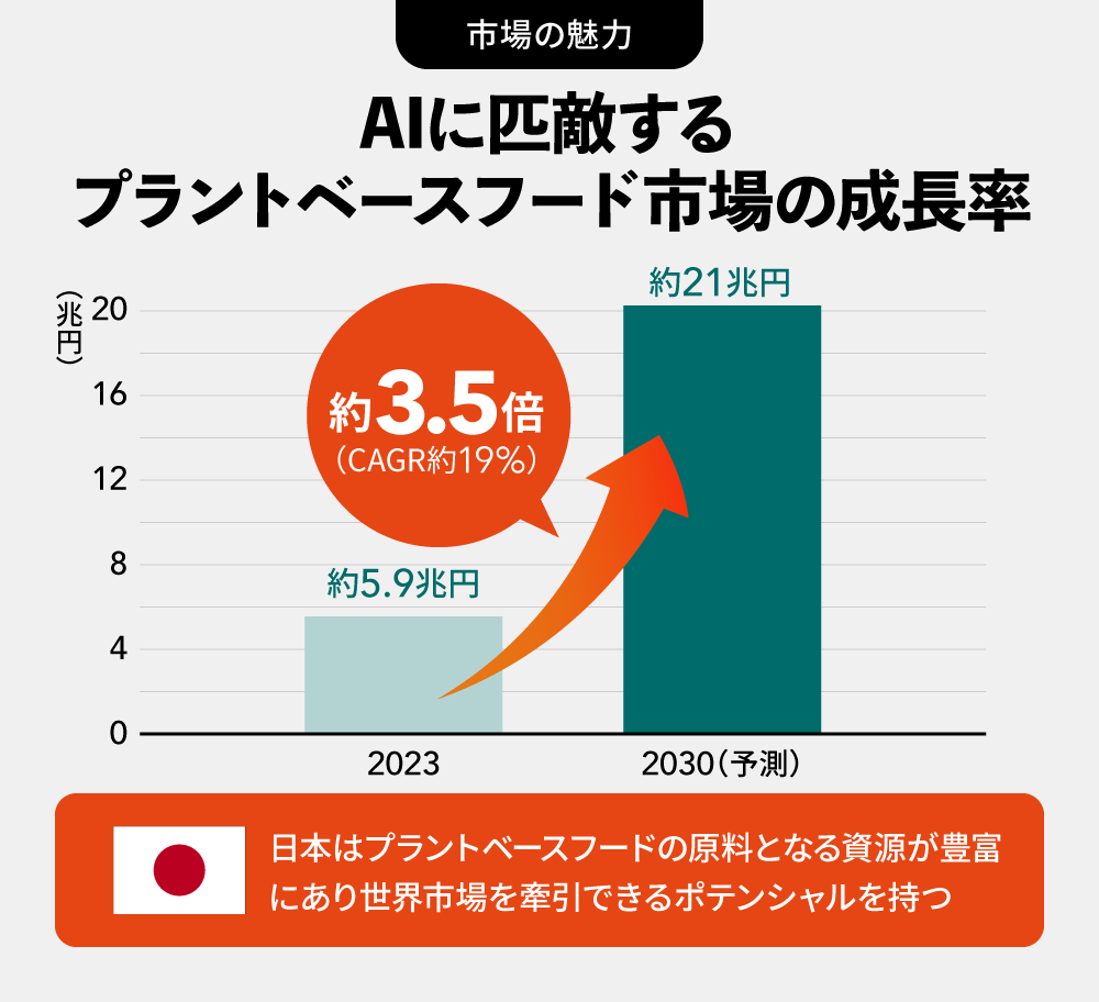 プラントベースフード市場は、食の多様化や世界的な健康志向の高まり、環境問題への関心の高まりから爆発的な成長を遂げています。世界市場規模は2022年の約5.9兆円から、2030年には約21兆円に達すると見込まれています。年平均成長率(CAGR)は、約19%で拡大すると予測されており、これは、近年のAI業界に匹敵する驚異的な成長速度です※。