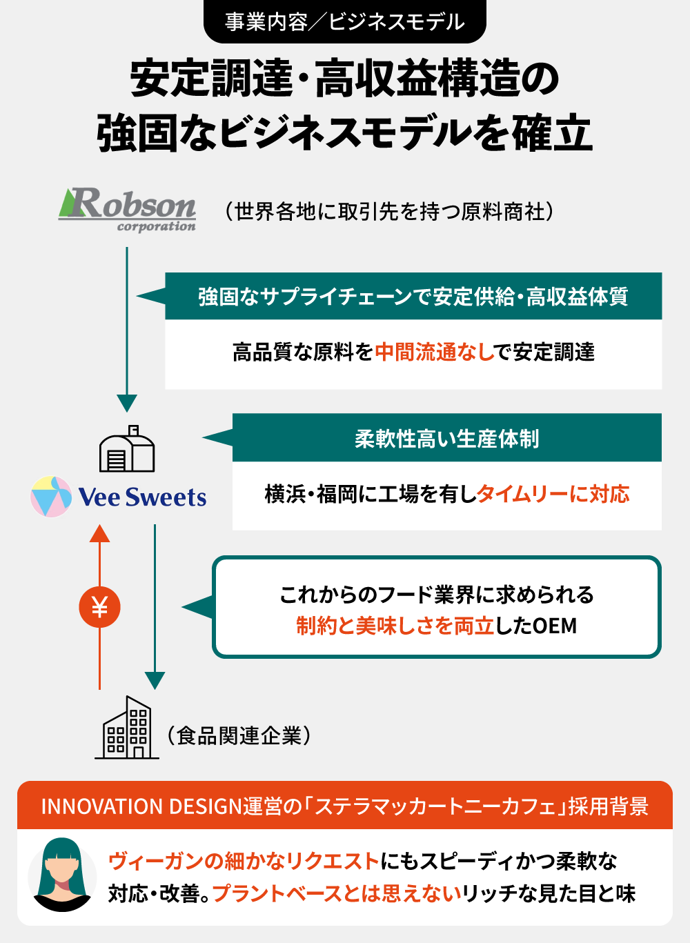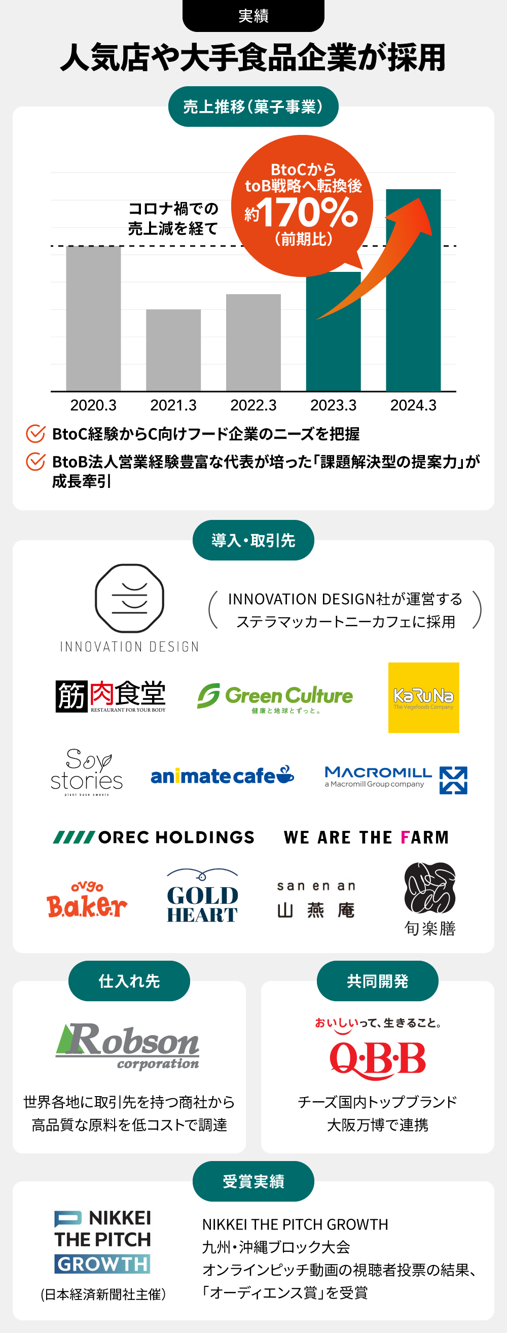 ヴィーガンカフェ「ステラマッカートニーカフェ」を手掛けるINNOVATION DESIGNや筋肉食堂、IWATAYA、アニメイトなど約30社に導入実績があり、BtoB事業に戦略転換後はスイーツ事業売上約170%(2023年3月期から2024年3月期)を達成しました。