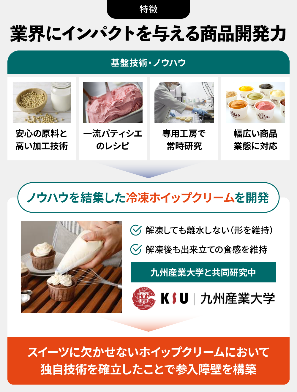この独自の開発技術は、弊社に大きな競争優位性をもたらし、プラントベーススイーツ市場におけるリーディングカンパニーとしての地位を強固にすると考えています。