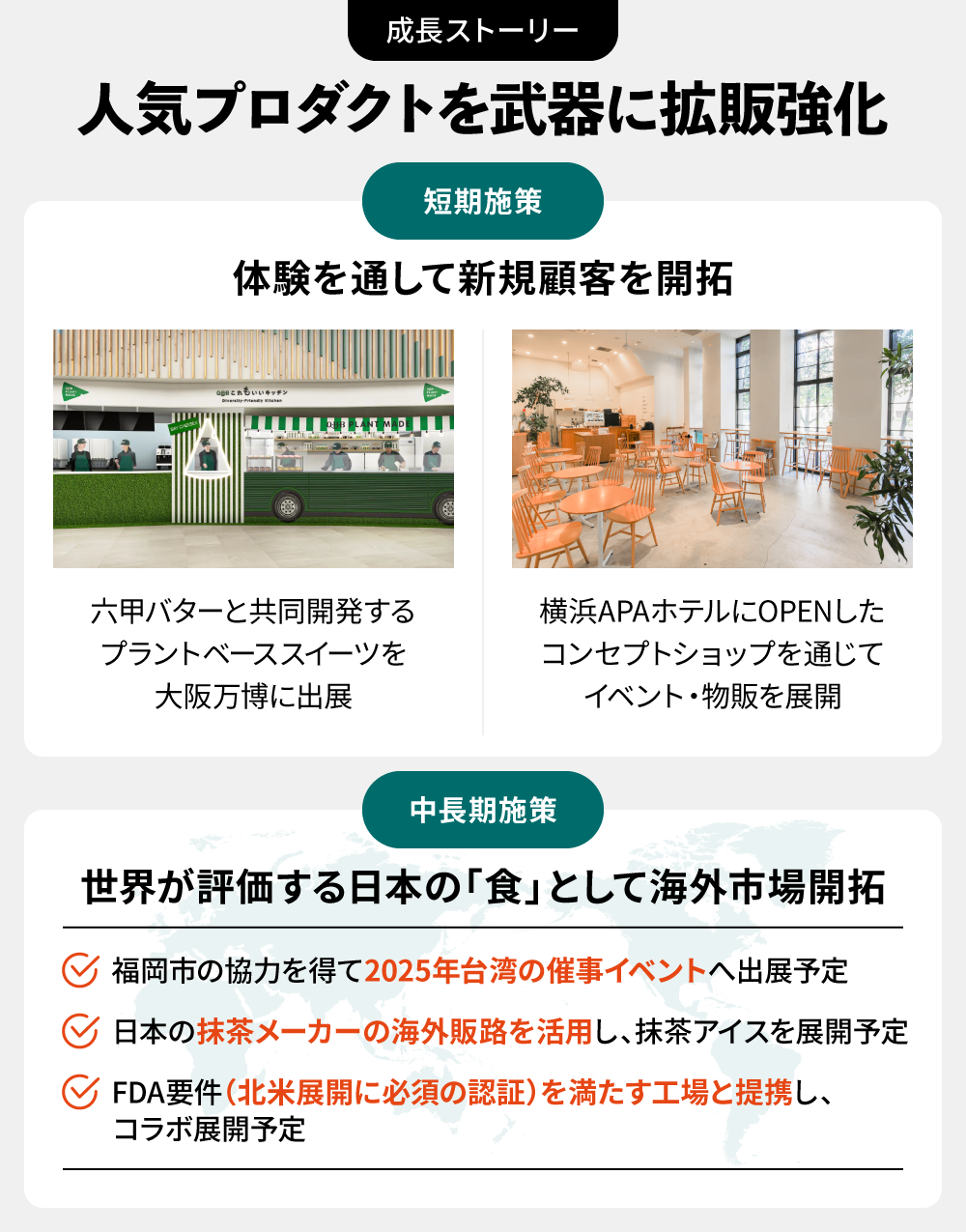 大豆を原料とした豆乳・味噌、米粉等、世界に誇れる日本の素材を活かし、まずはスイーツメーカーの領域で圧倒的シェアを高めながら、「プラントベース」という新たな食の未来を創造する、革新的なフードテック企業として、更なる成長を目指します。
