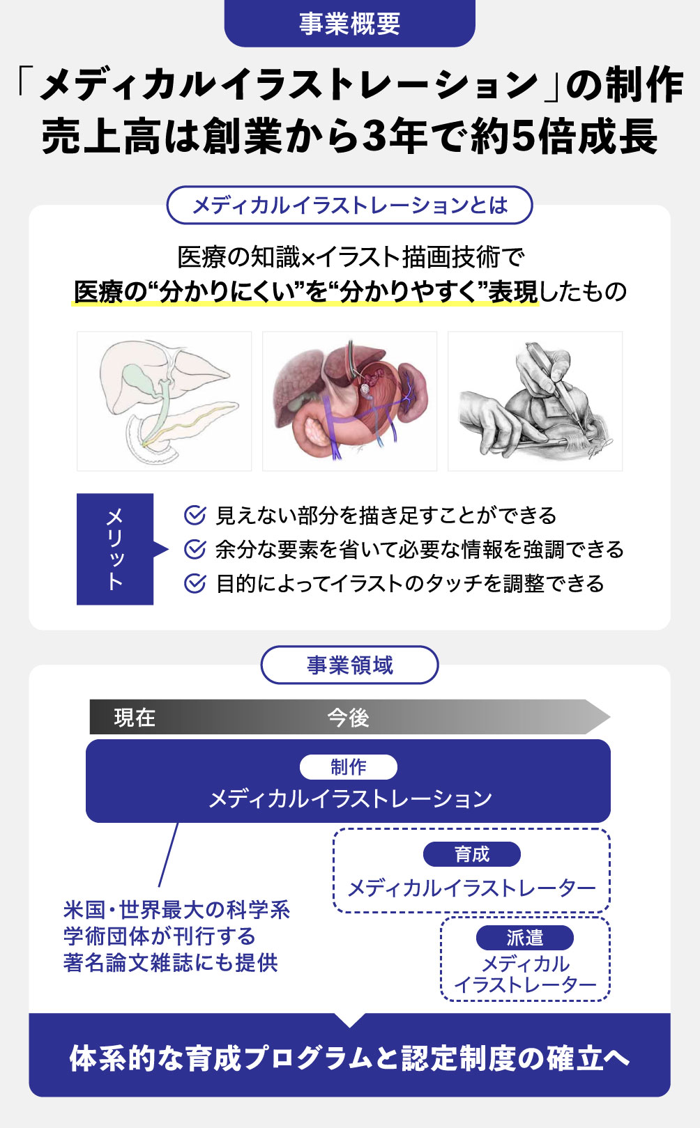 領域に特化した「メディカルイラストレーター」を育成する専門職ビジネスを進める計画です。