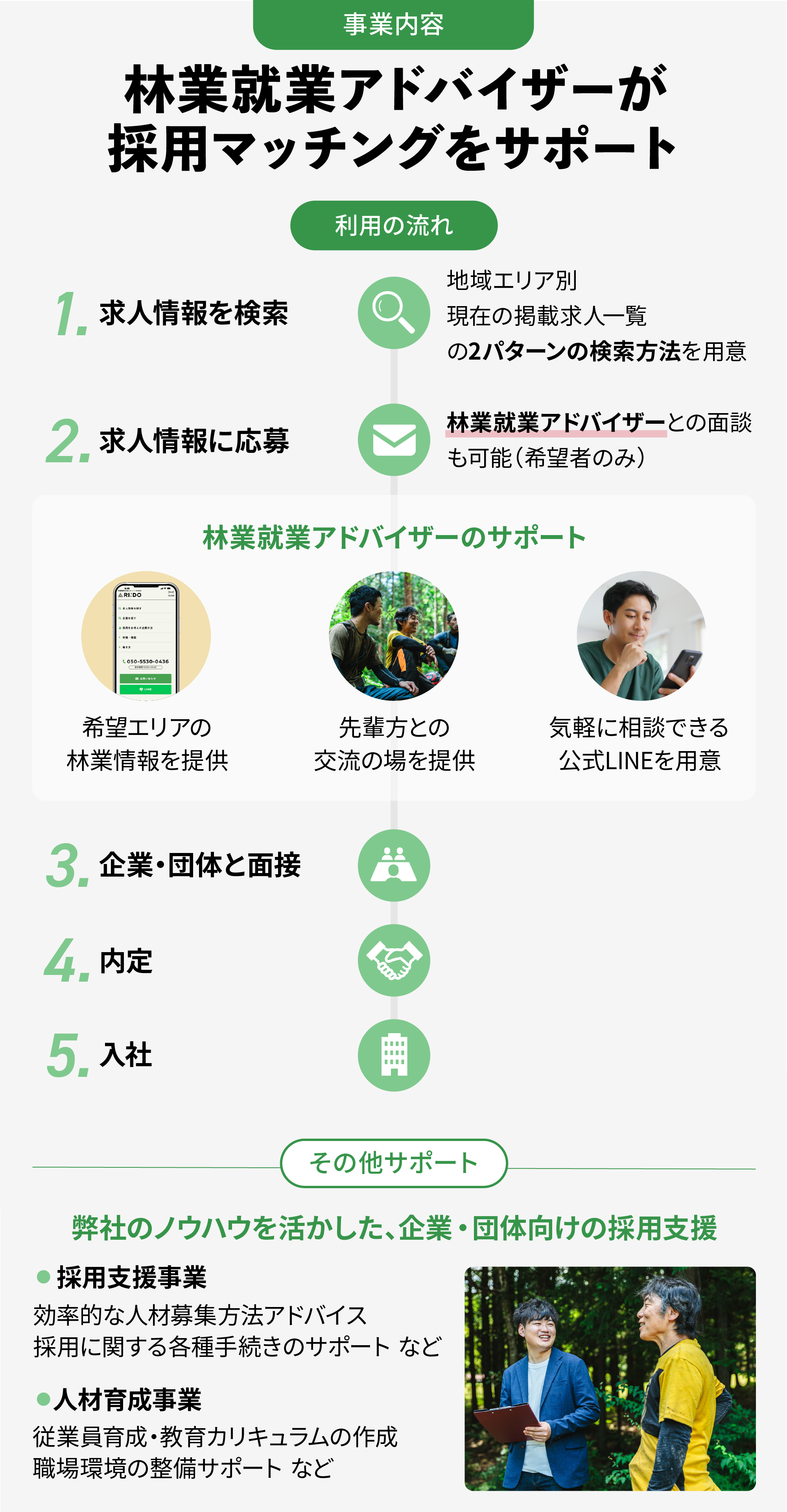 弊社は、全国の林業の求人情報を紹介する就職・転職支援サービス「RINDO」を運営しています。