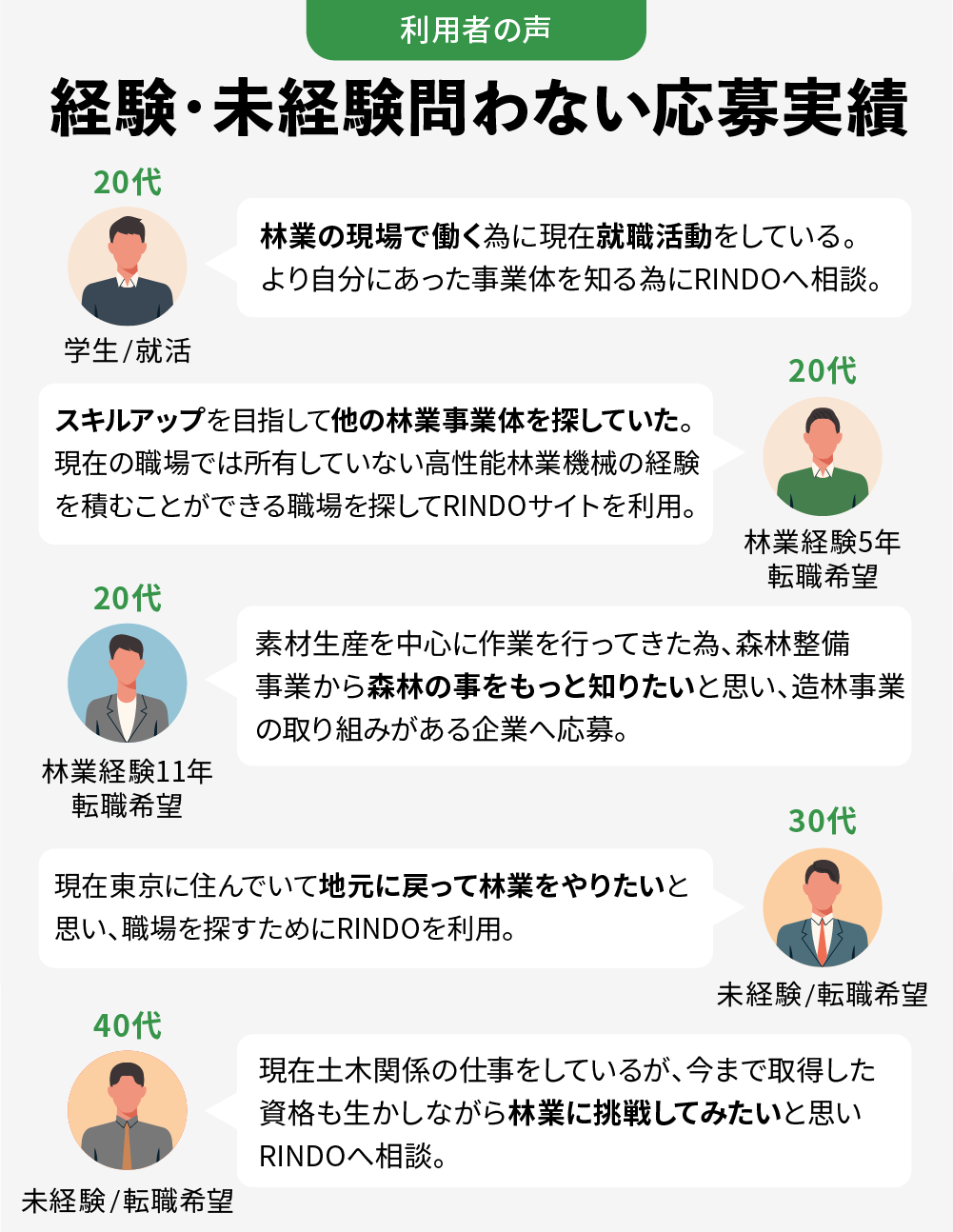 「RINDO」は、専門知識を持つベテランから意欲ある未経験者まで、多様な人材と林業企業をつなぐ架け橋として重要な役割を担っています。