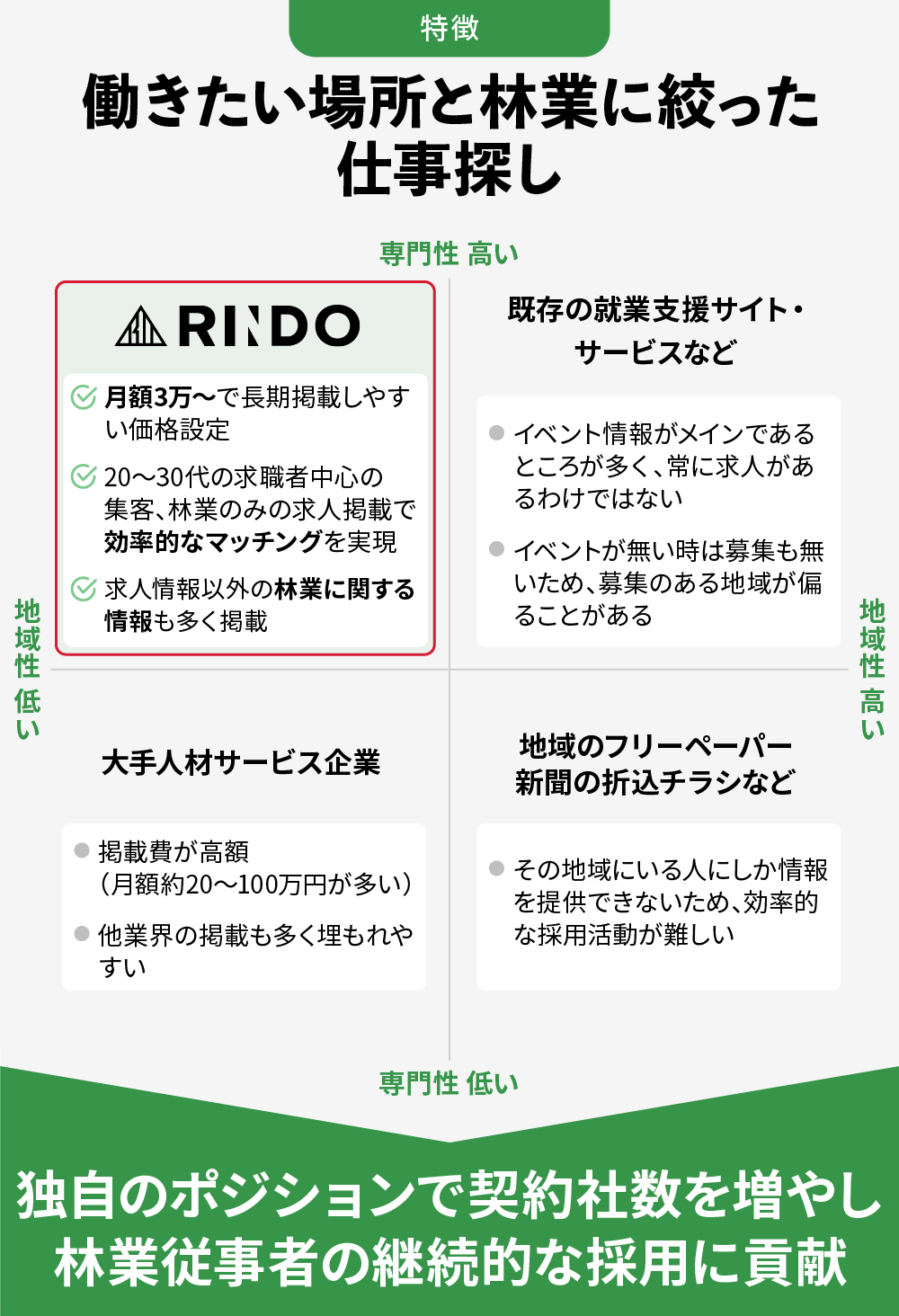 前期までに有料求人広告サービスである「RINDO」を展開しており、1年間で約38社の林業事業体の求人広告を掲載させていただいてきました。