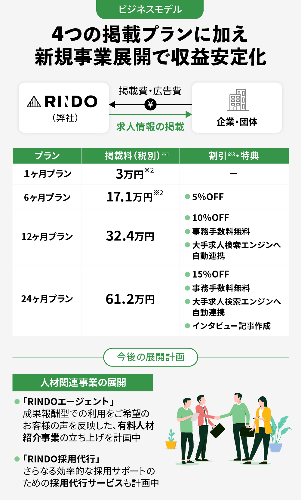 弊社の主な収益源は「RINDO」への掲載費で、1、6、12、24ヶ月の4つの期間の掲載プランを設けており、2024年1月のサービス開始から1年ですでに38社の掲載実績があります。