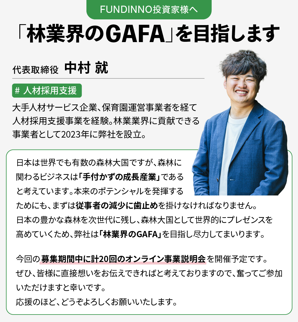 この度の資金調達を機に人材紹介業の免許も取得して収益性を高めることと共に、地球環境対策に直結している林業界を目指す人材を増やしてくれることに私は期待をしています。