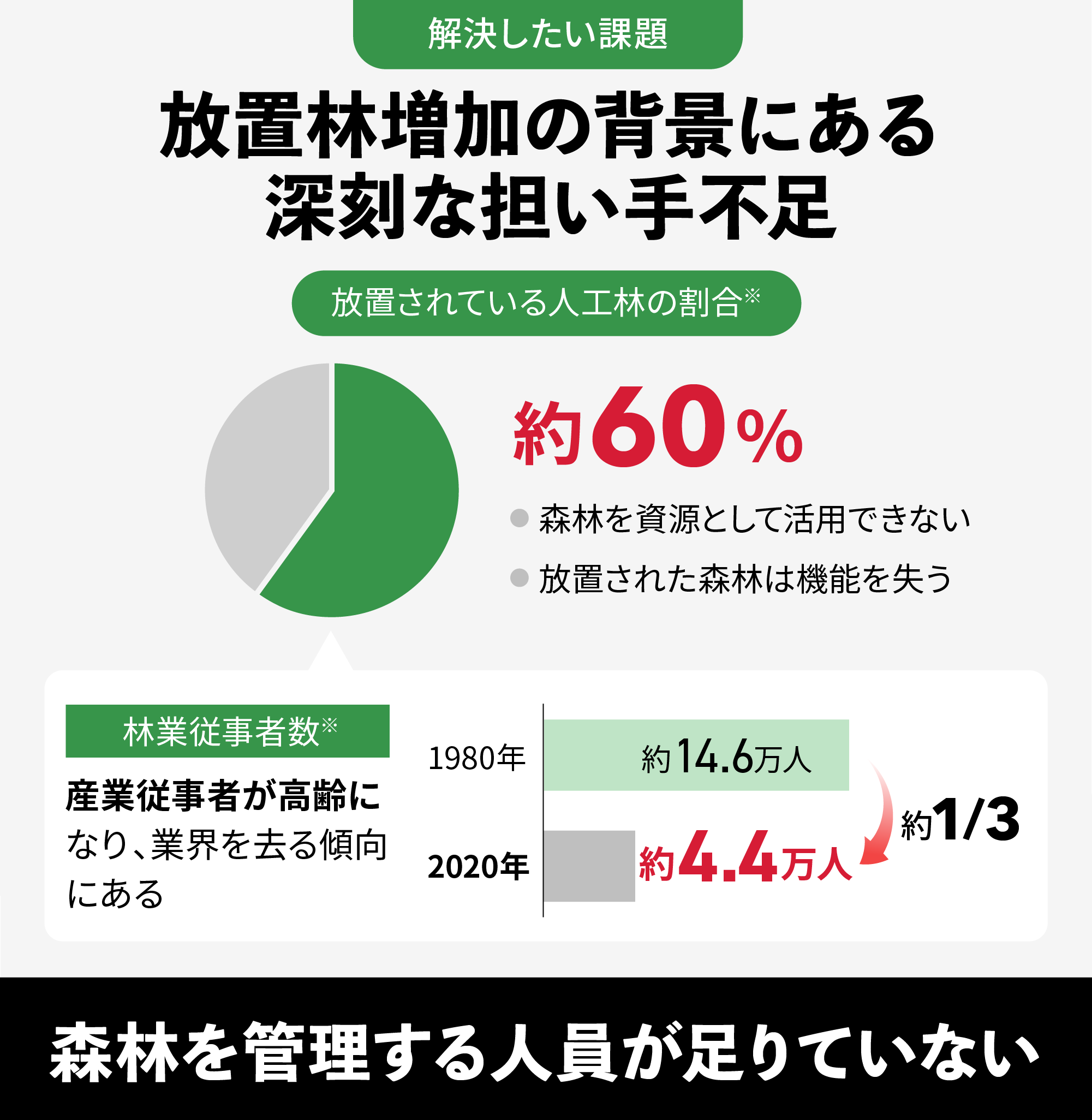 このままでは林業の担い手が減少し、本来は日本の強みである自然を整備できなくなってしまいます。すると、土砂災害の増加などで経済的な損失にもなりかねません。