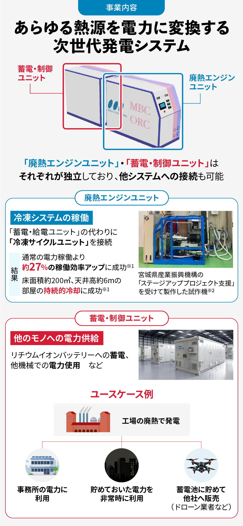 æ±æ¥æ¬å€§éçœã奿©ã«ãå°ç±ã»æž©æ³ç±ã»ç£æ¥ç³»å»ç±ãªã©ã掻çšããORCçºé»ã·ã¹ãã ãæ³šç®ãéããäžããç±ã»æ°Žã»ç©ºæ°ãã®ãšãã«ã®ãŒãšããŠã®é«åºŠå©çšã®ç ç©¶ã»æœå·¥ãæãããŠããèªç€Ÿã®åŒ·ã¿ã掻ããã¹ãã2010幎é ããORCçºé»ã·ã¹ãã ã®éçºã«çæããŸããã