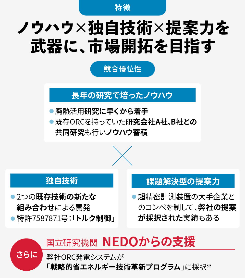 NEDOãç£æ¥æè¡ç·åç ç©¶æã§ã®ãã€ããªãŒçºé»æ©ã¡ãŒã«ãŒãšã®å ±åç ç©¶ã§çºé»æè¡ã®ããŠããŠãèç©ãããŠããããé察称ã¹ã¯ããŒã«åèšåŒµæ©ãããã«ã¯å¶åŸ¡ãã®æè¡ãšåãããORCçºé»ã·ã¹ãã ã®éçºãšå»ç±å©çšã®åãçµã¿ã«ãããŠå€§ããªåªäœæ§ã«ãªããšèããŠããŸãã