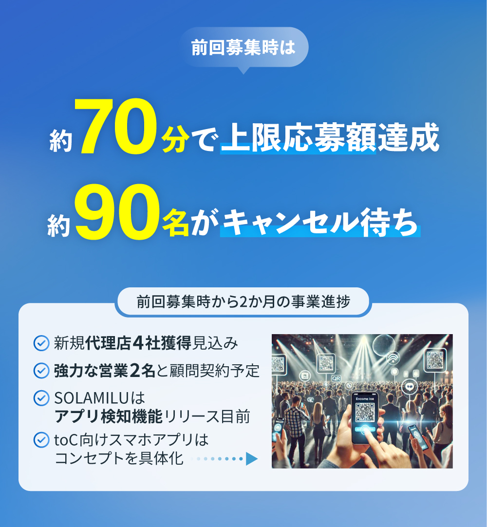 A. 前回の募集は開始からわずか70分で終了し、想定を上回るスピードで資金調達ができました。この短時間で上限に到達したことにより、多くの取引先様や知人から「購入できなかった」「次回の募集はいつになるのか?」というお問い合わせを複数いただきました。
