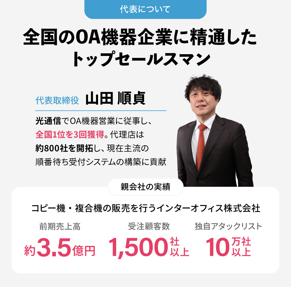 代表・山田は、光通信にてOA機器営業に従事し、全国1位を3回獲得。名古屋のエリアマネージャーに就任したのち、代理店事業では約800社の新規開拓を手がけ、法人向け携帯電話販売の基盤を築きました。また、同社の子会社で現在主流となっている順番待ち受付システムの前身となるスキームを構築するなど、多くの成果を上げました。